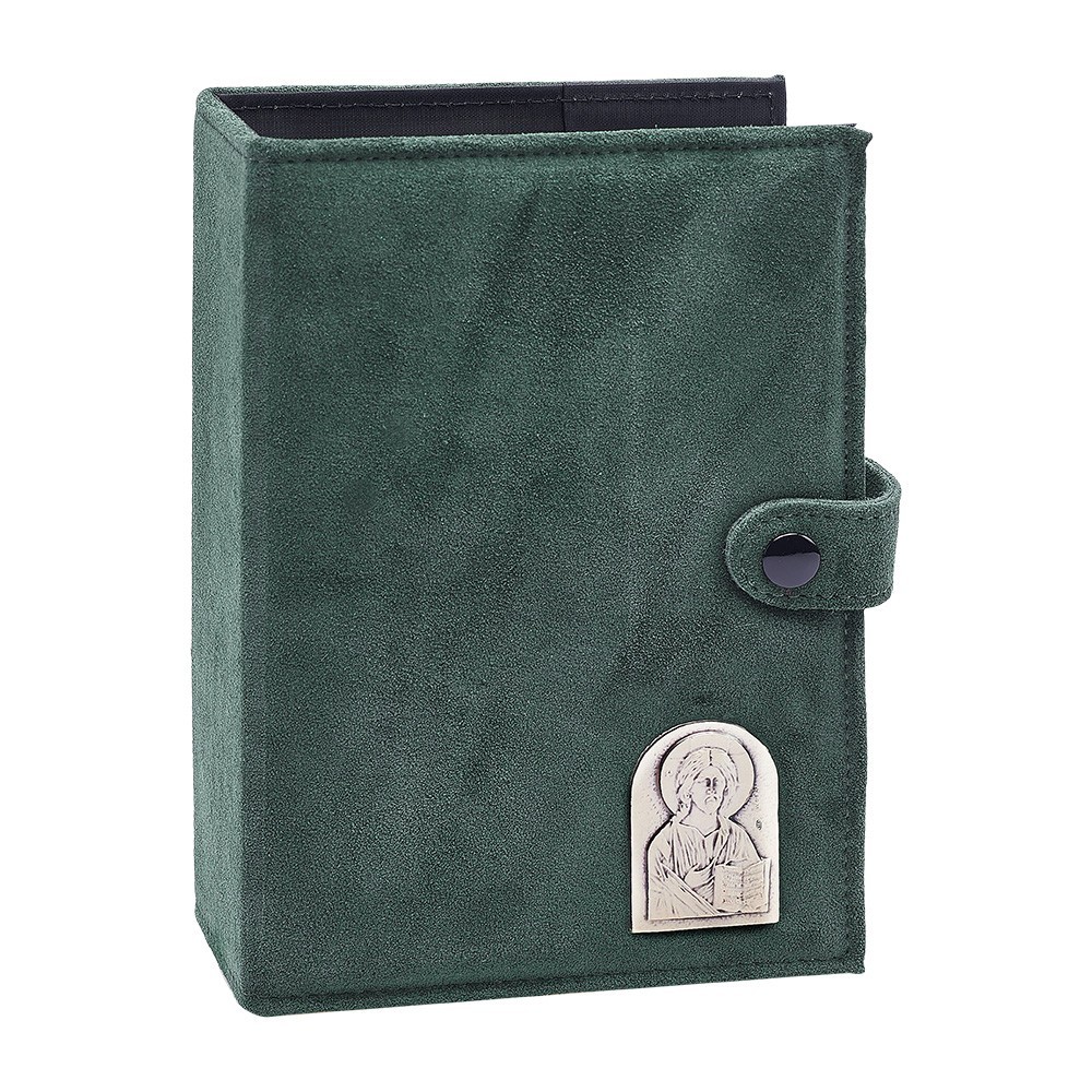 Copri custodia Liturgia delle ore (4 volumi) realizzata di colore verde scamosciata, completa di bottone.