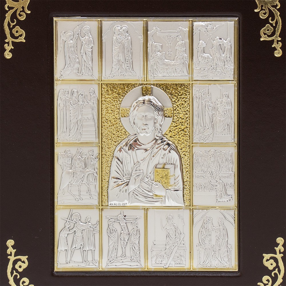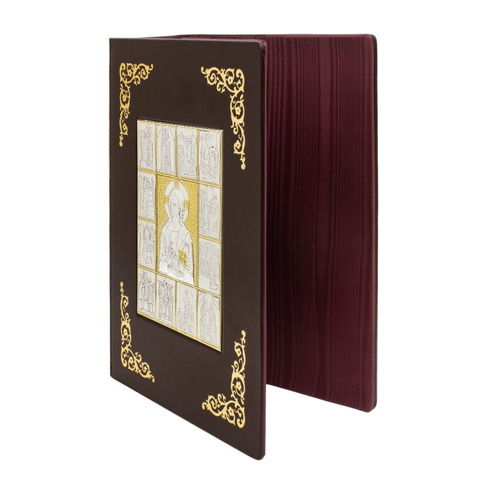 Custodia per Messale realizzata in pelle color marrone e placca in argento raffigurante Gesù Pantocratore con scena della vita.