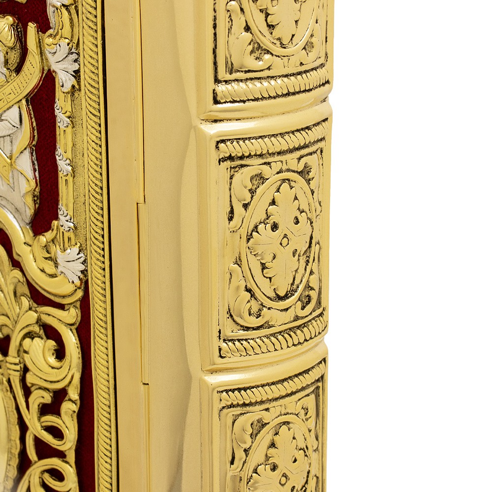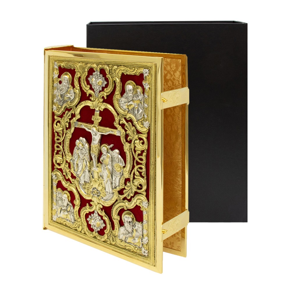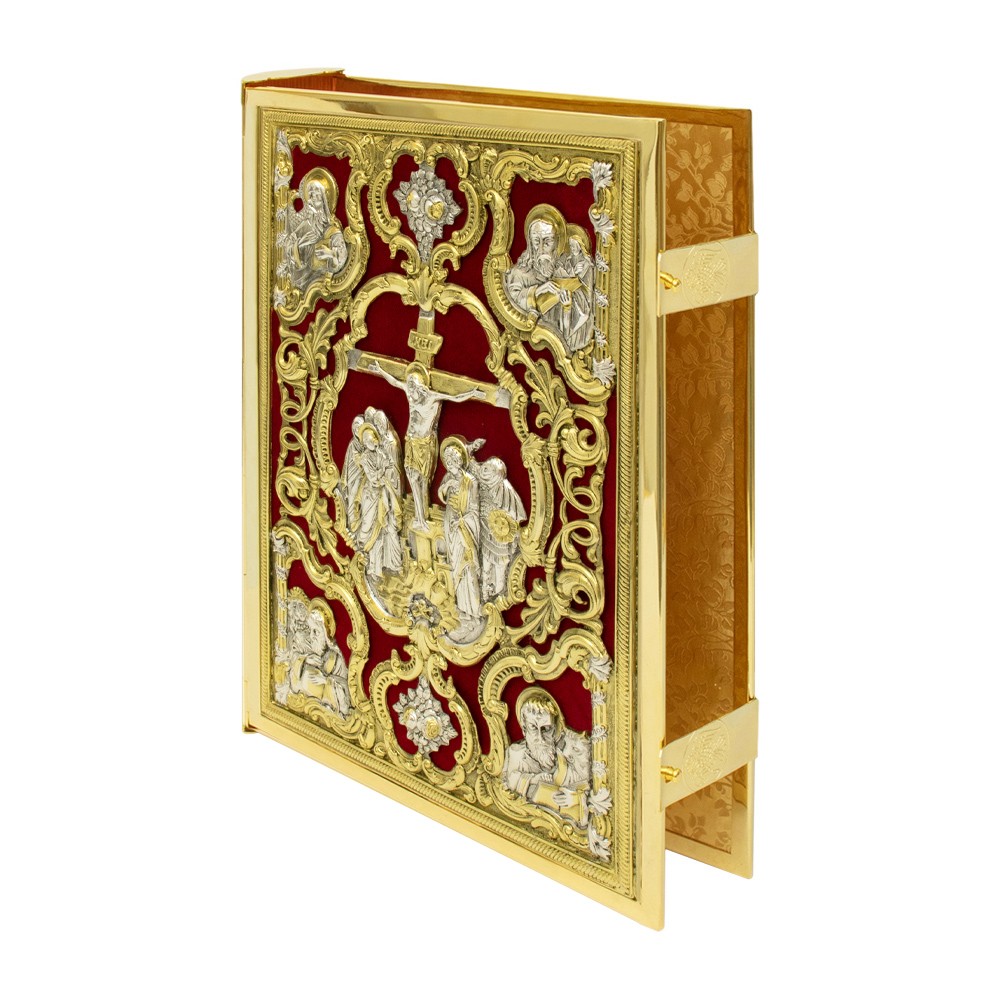 Questo prezioso copri lezionario è realizzato con lavorazione a sbalzo riproducendo i quattro Evangelisti, la crocifissione di nostro Signore Gesù Cristo e la sua Resurrezzione.
