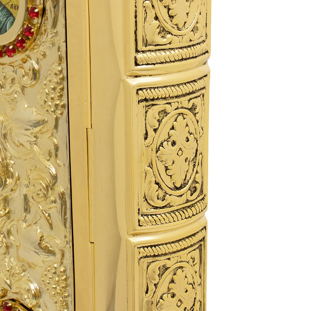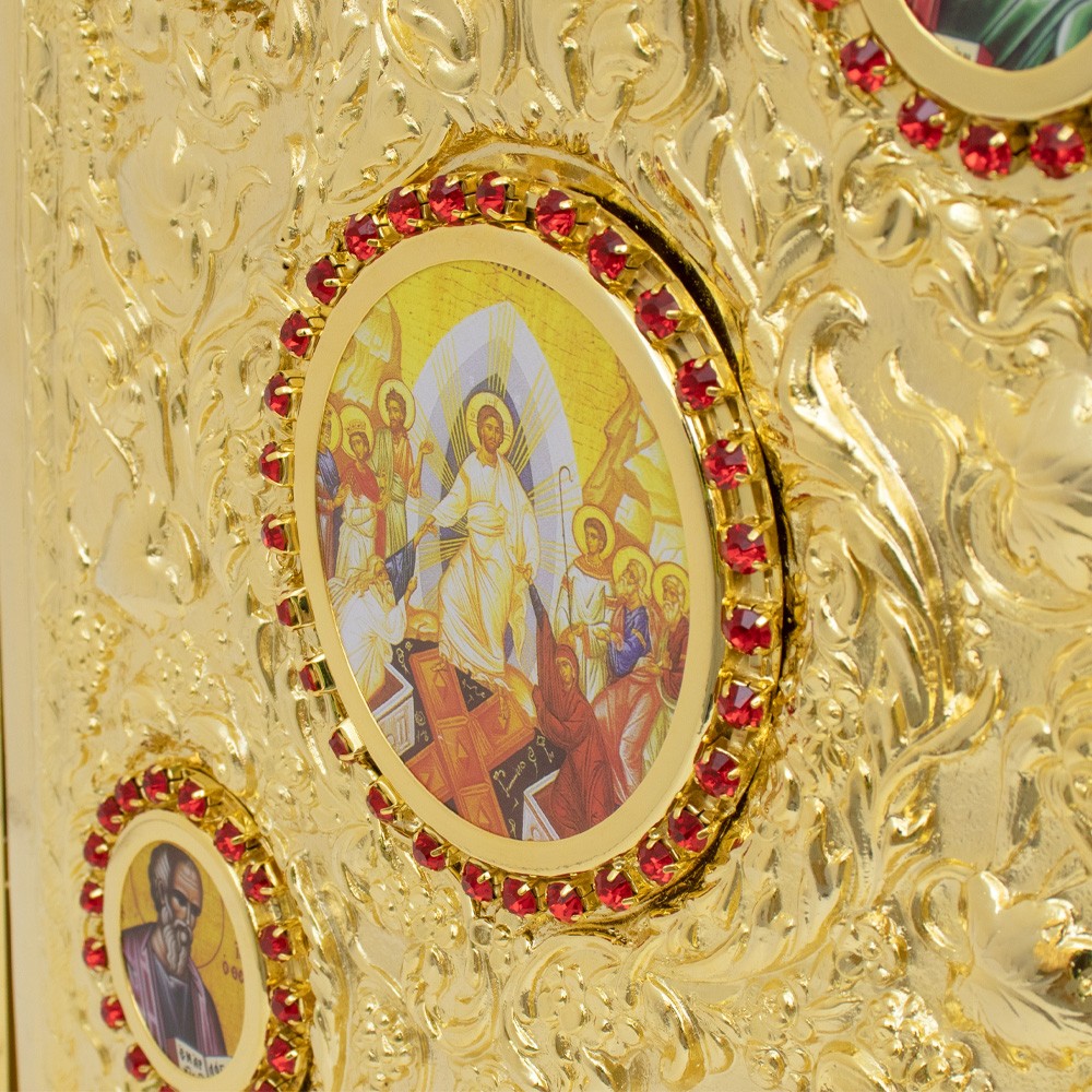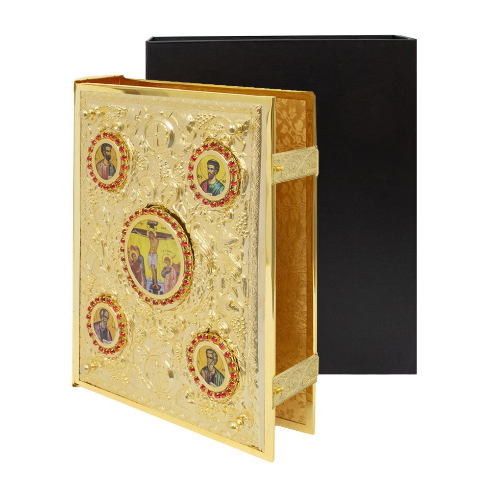 Sul copri messale sono riprodotti sia i volti dei quattro Evangelisti che la Crocifissione di Gesù Cristo.