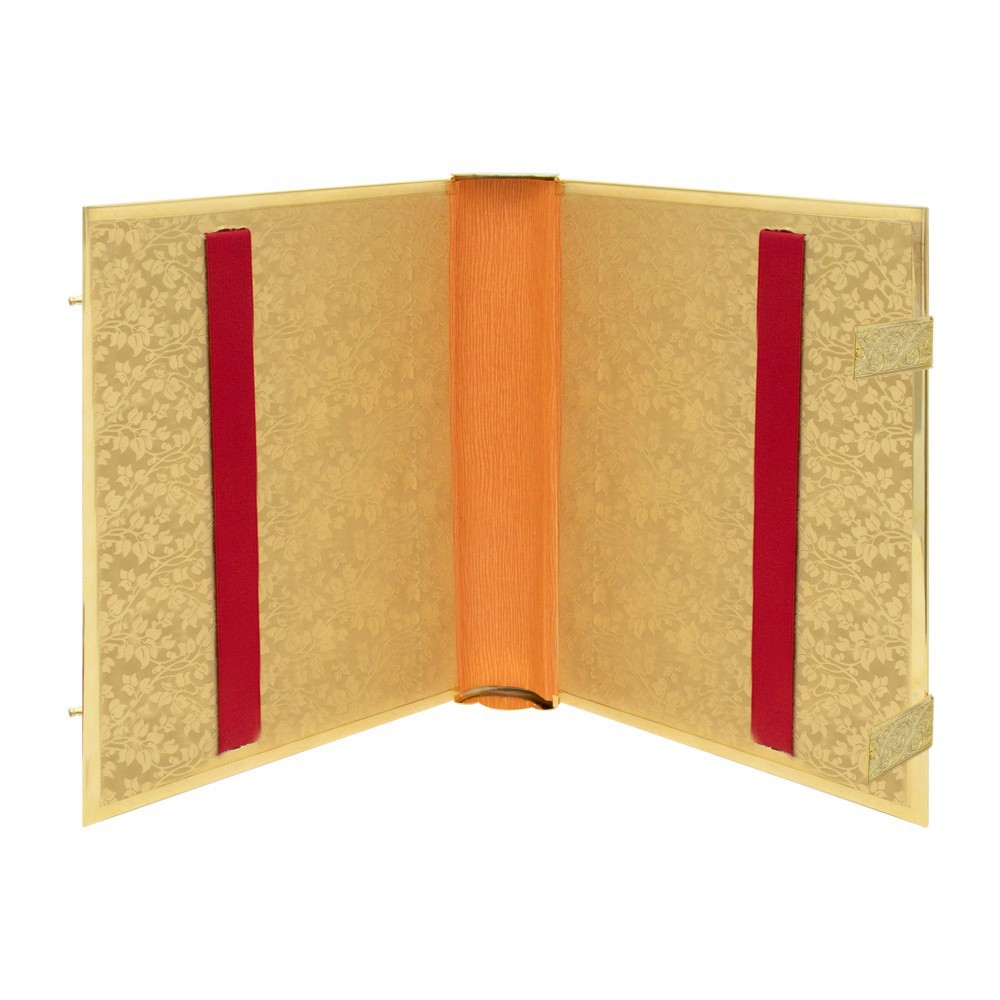 Elegante copri messale in metallo dorato con lavorazione a sbalzo.