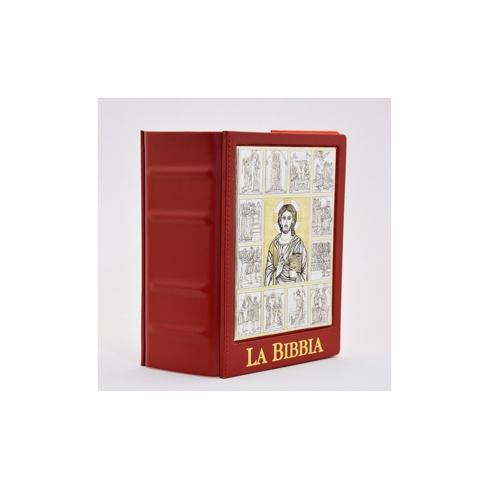 Custodia per Bibbia di Gerusalemme 2009 ed. Dehoniane in cuoio rosso con immagine del Cristo Pantocratore e della Vita di Gesù stampata su placca in argento. Questo copri bibbia è interamente realizzato in Italia da aziende specializzate nella produzione di copertine per testi sacri.