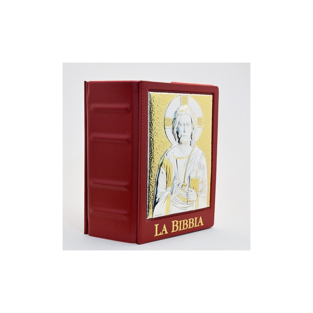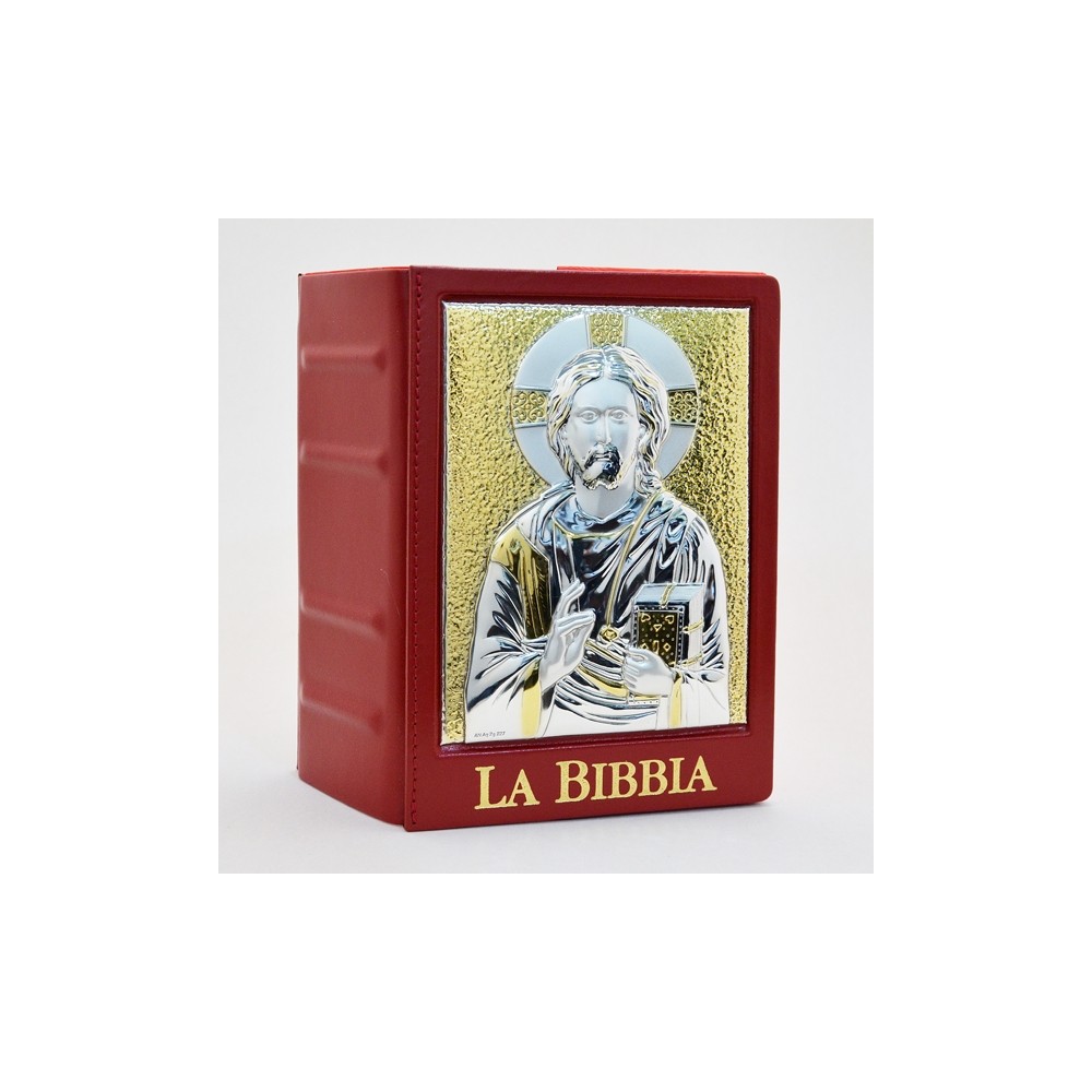 Custodia per Bibbia di Gerusalemme 2009 ed. Dehoniane in cuoio rosso con immagine del Cristo Pantocratore su placca in argento e oro. Realizzata interamente in Italia.
