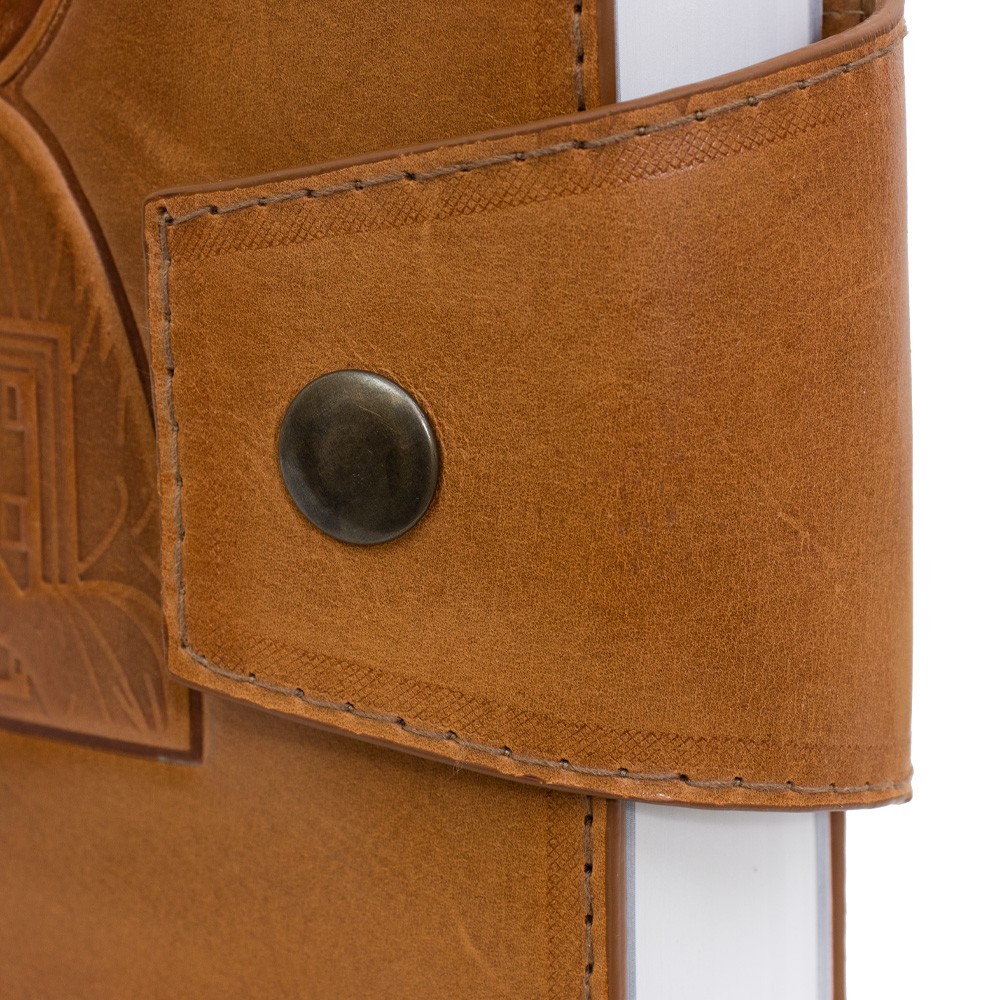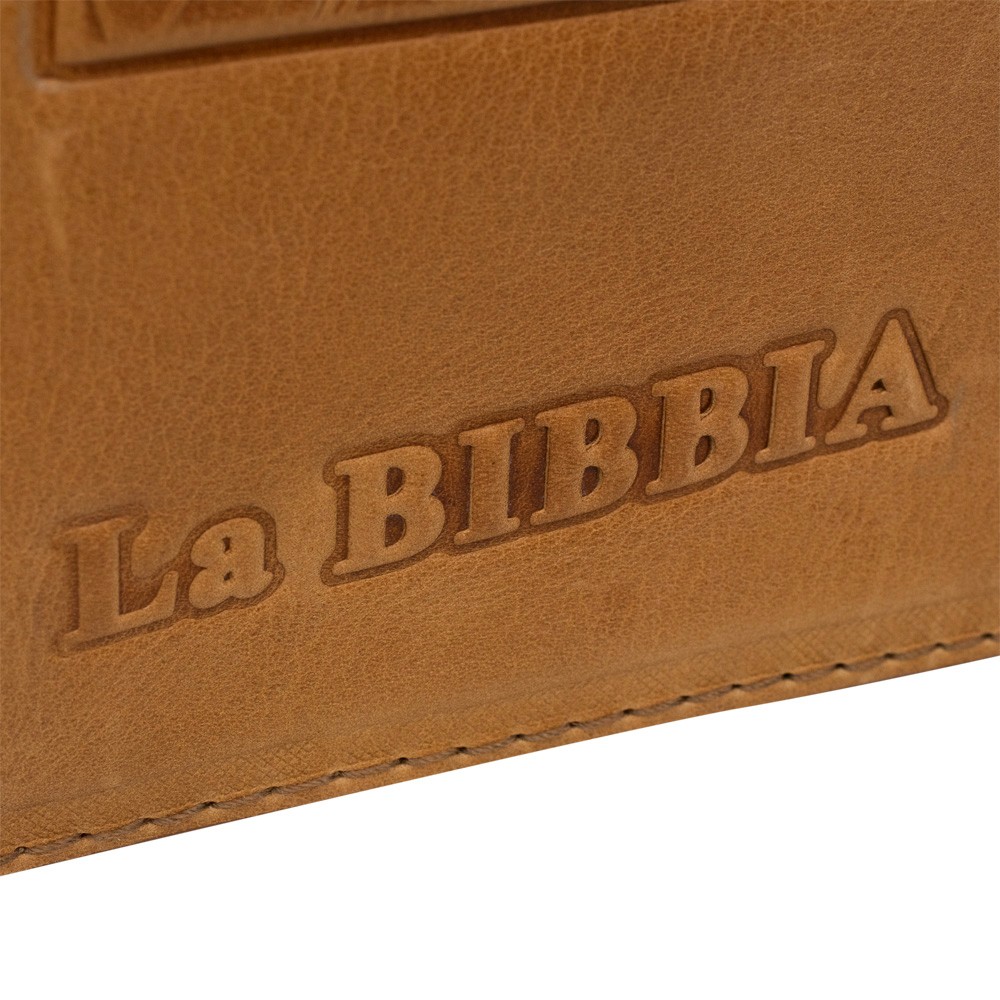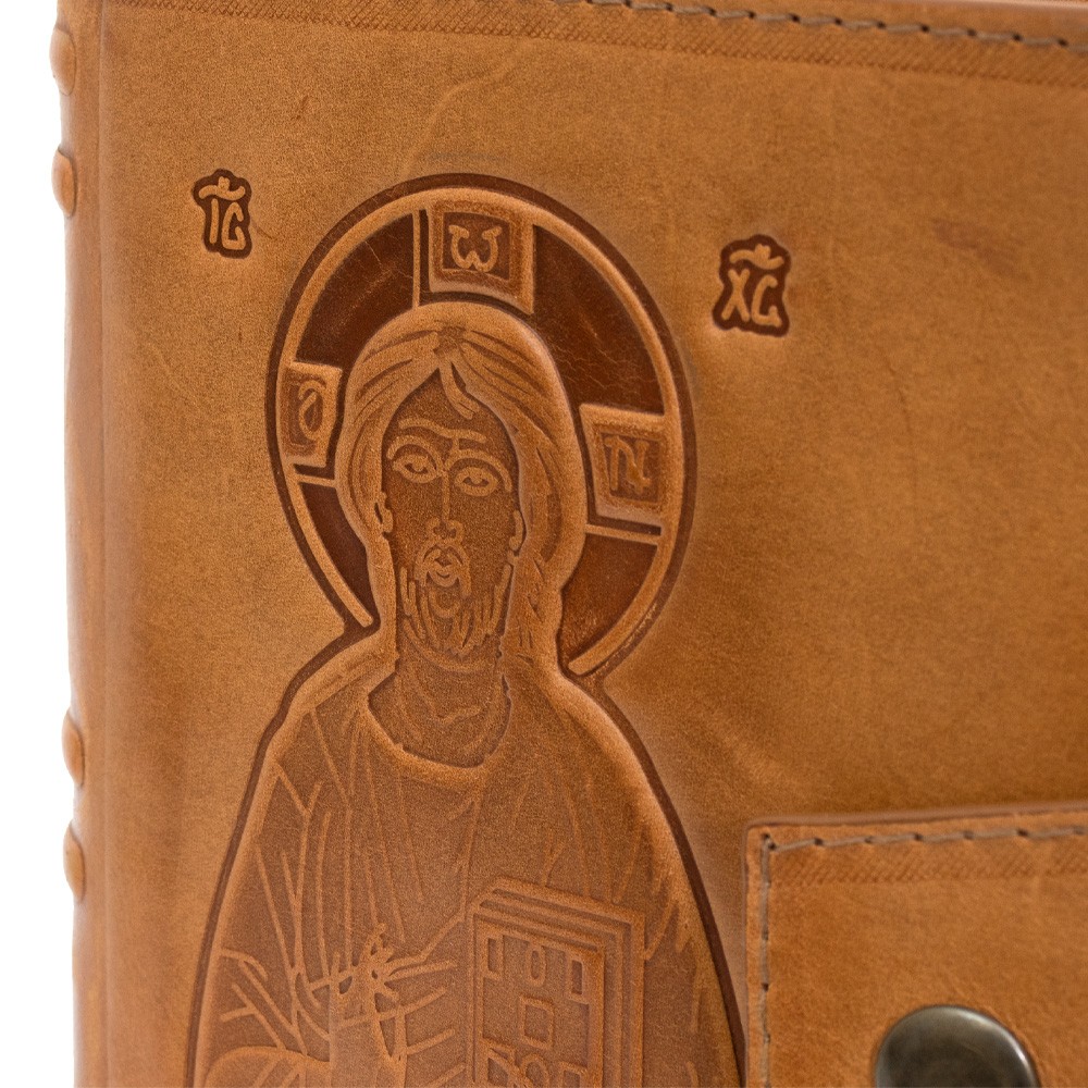 Custodia per Bibbia prodotta in vera pelle naturale, completa di bottone e stampa a pressione sul fronte raffigurante Gesù Pantocratore.