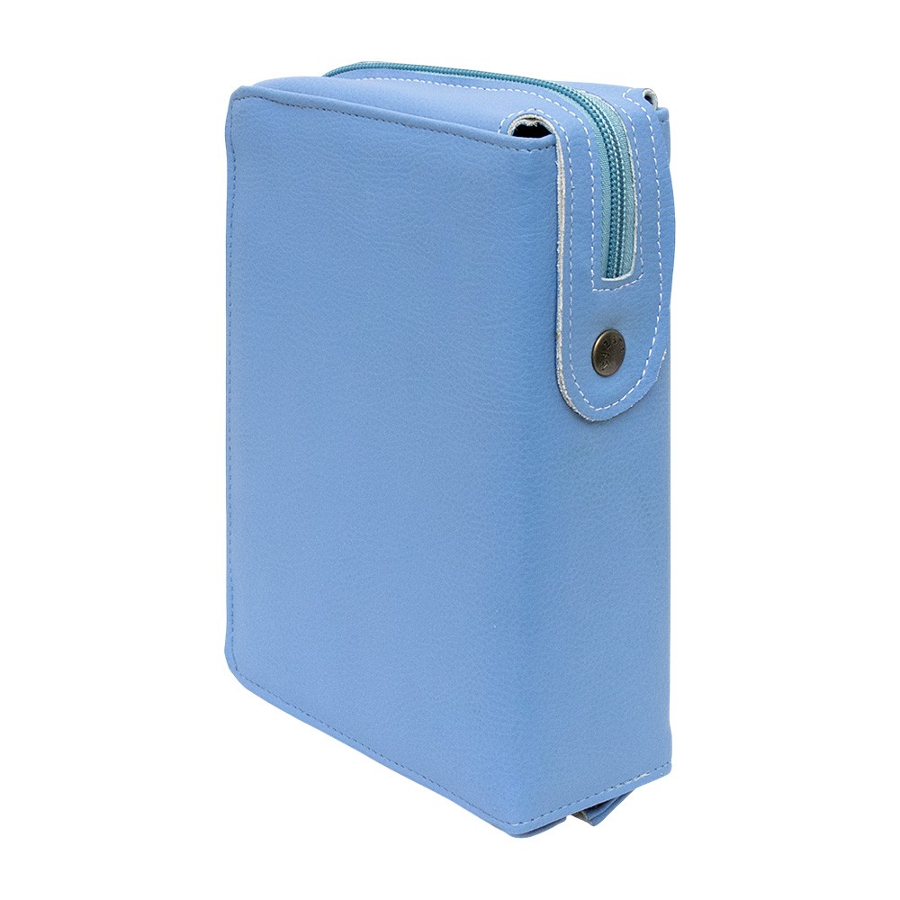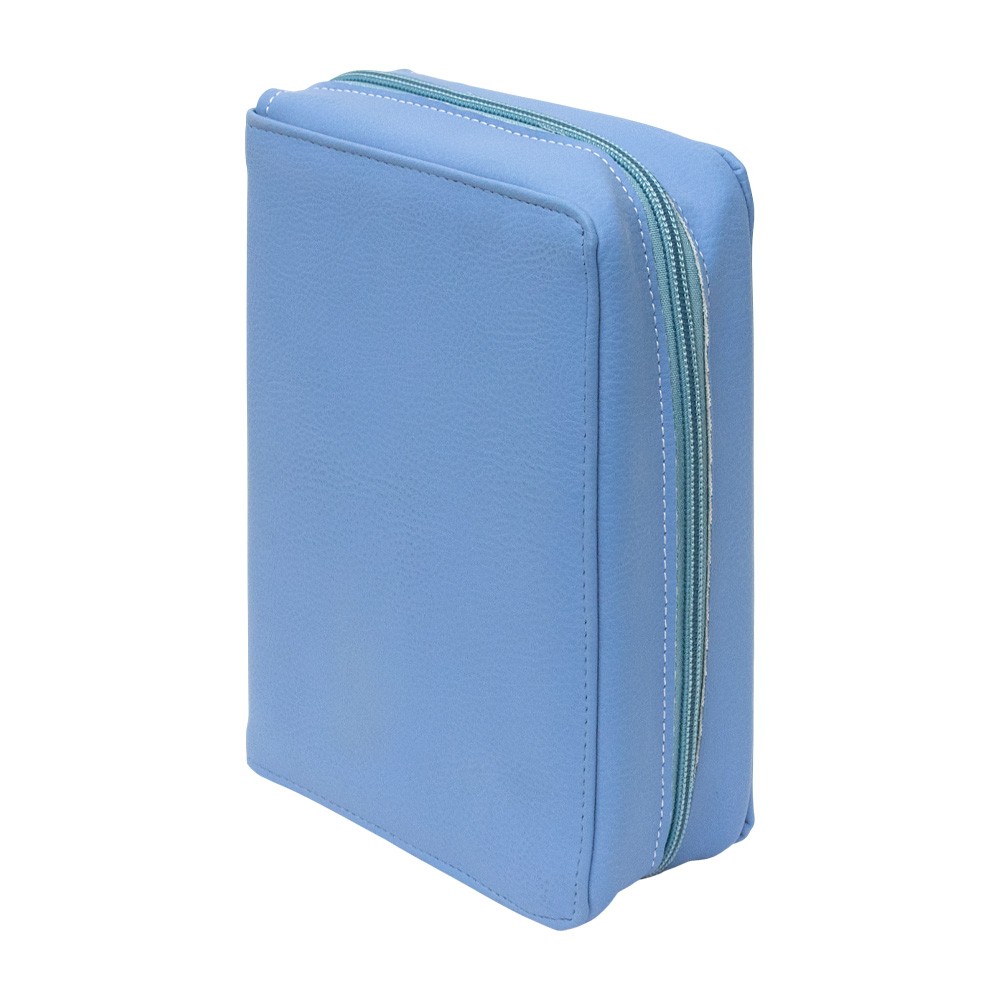 La custodia è pelle celeste e interno in fodera, dotata di cerniera per una chiusura sicura.