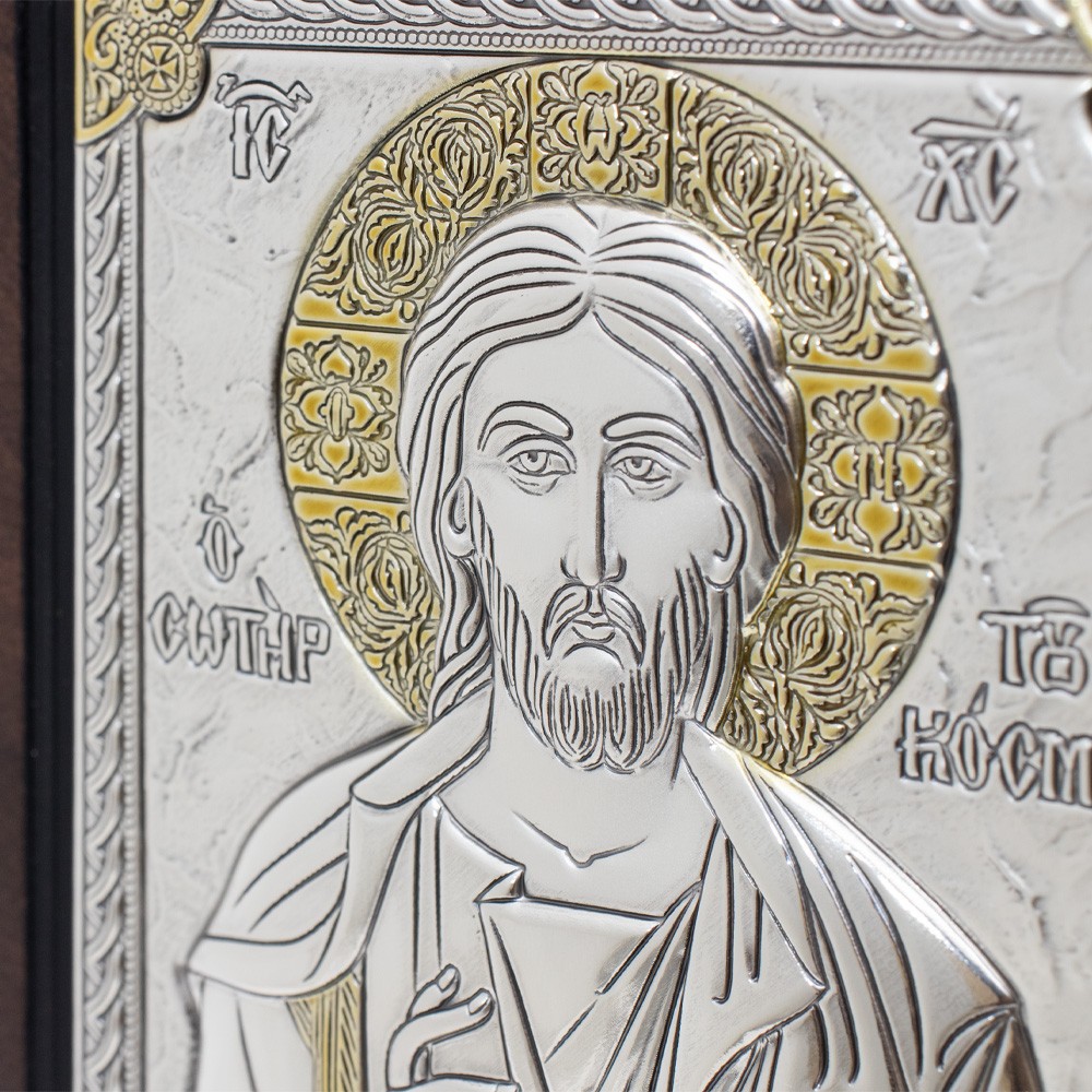 La placca (formato 9x13 cm) è interamente in argento bilaminato bicolore, ed è raffigurati il Cristo Pantocratore.