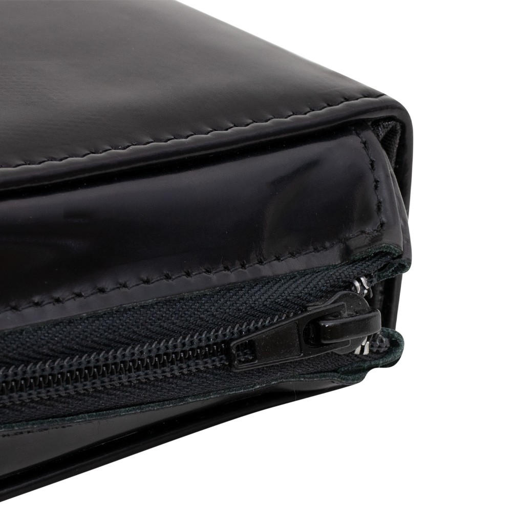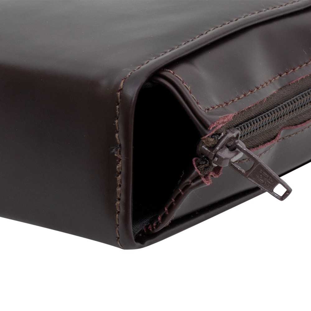 Realizzata in vera pelle marrone con chiusura lampo e interno fodera scura.