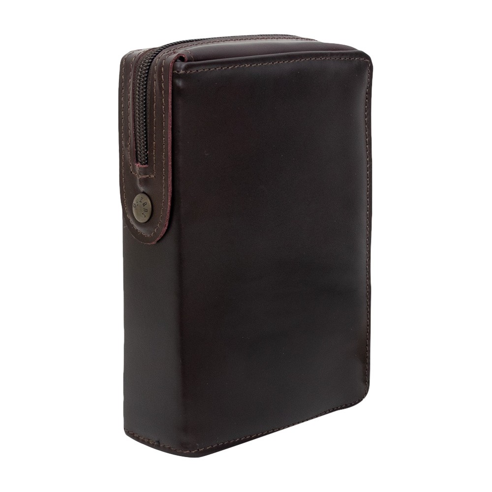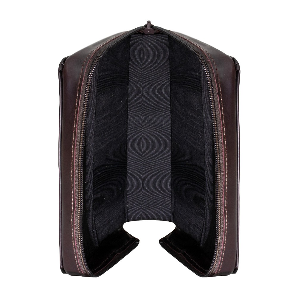 L'interno della custodia è rivestito in fodera scura, mentre l'esterno è in pelle disponibile sia nel colore marrone scuro che nero.