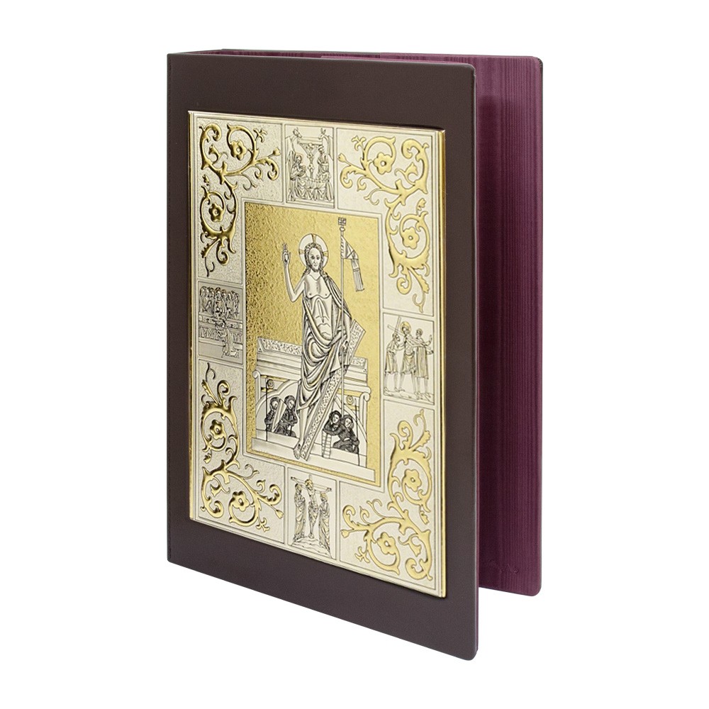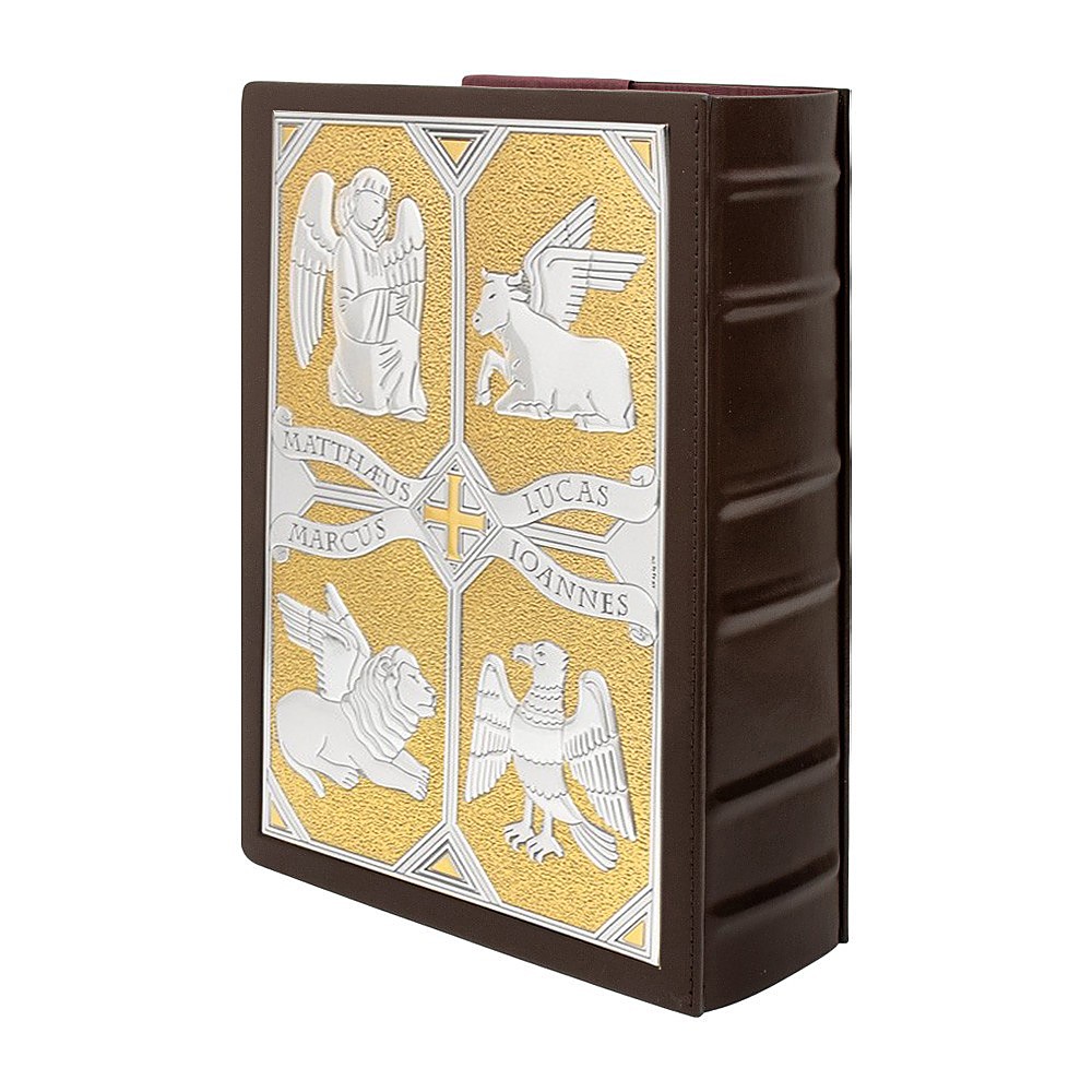 Copertina Messale realizzato inn vera pelle, di colore marronescuro, con due placche in argento e dorato. Sul fronte è presente l'immagine principale di Gesù Cristo e contornato da raffigurazioni dei 4 Evangelisti e sul retro l'immagine dei 4 Evangelisti. Prodotto realizzato interamente a mano, da un'azienda italiana.