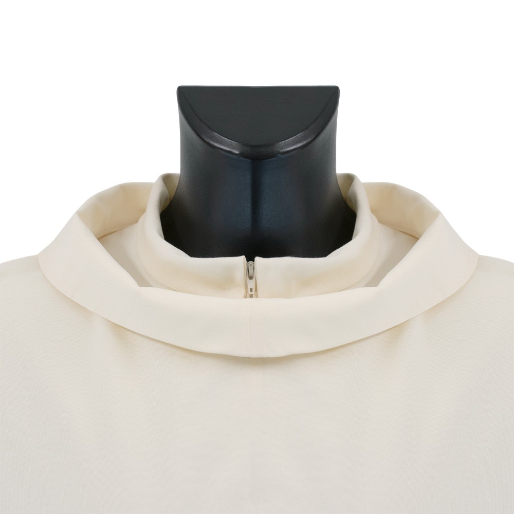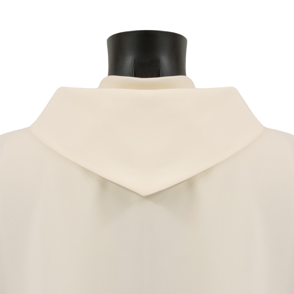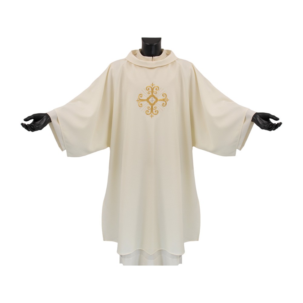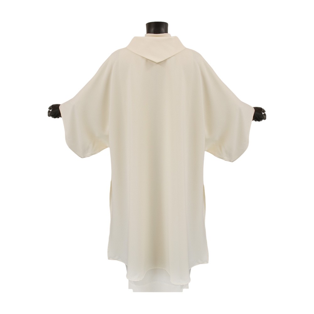 Dalmatica liturgica color avorio con collo ad anello, realizzata in resistente e leggero tessuto 100% poliestere.