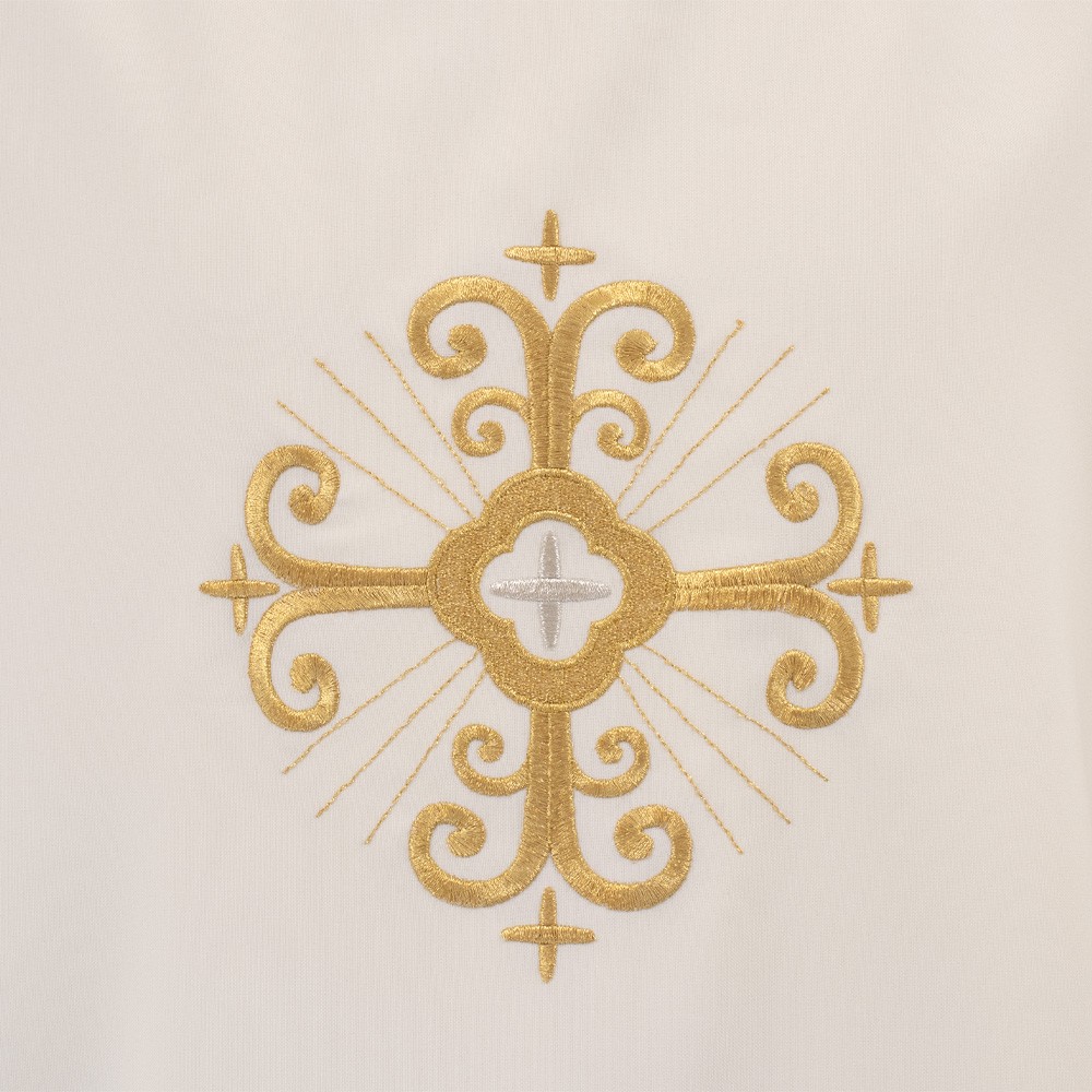 La dalmatica si presente con croce ricamata sul fronte, eseguita interamente a macchina con telai di alta precisione.