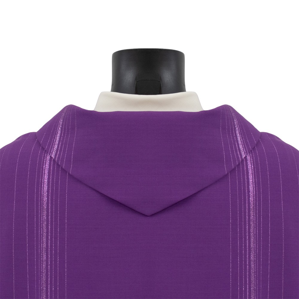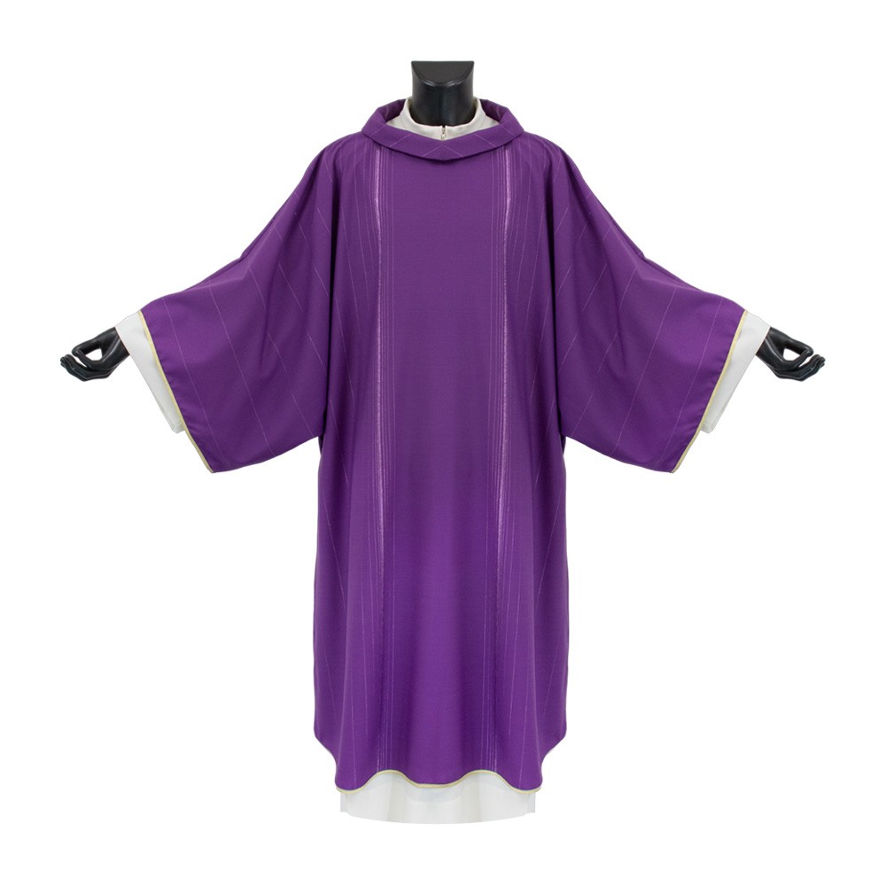 Dalmatica diacono viola confezionata in tessuto misto lana rigato.