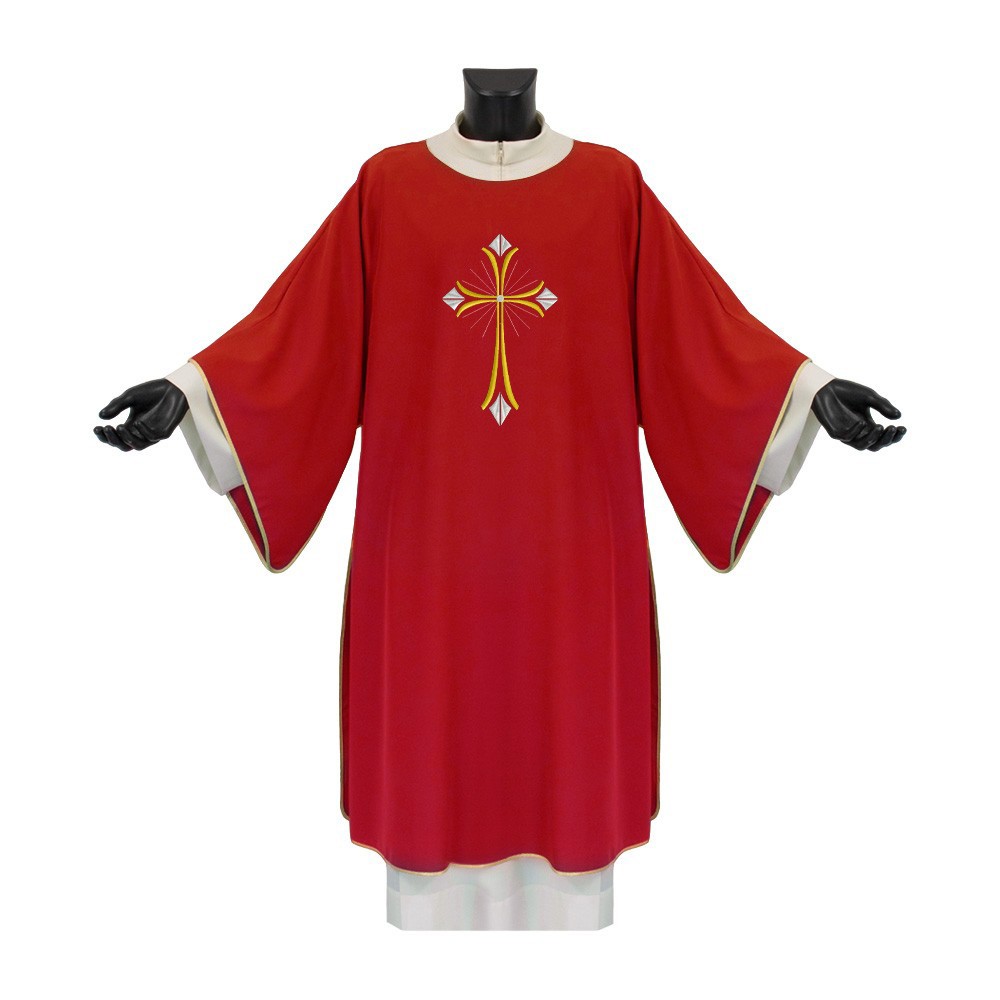 Questa dalmatica, perfetta per celebrazioni liturgiche, è confezionata in tessuto 100% poliestere, garantendo comfort e resistenza nel tempo.