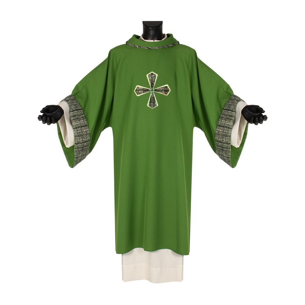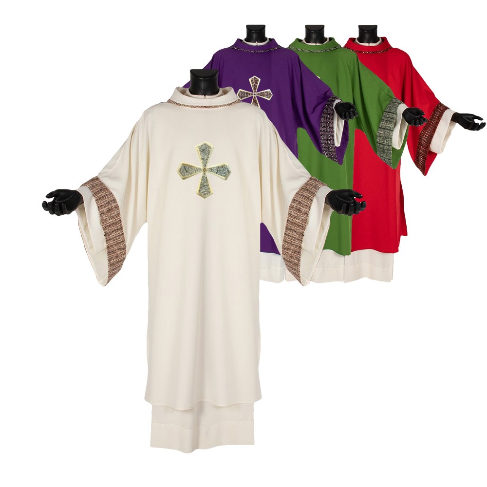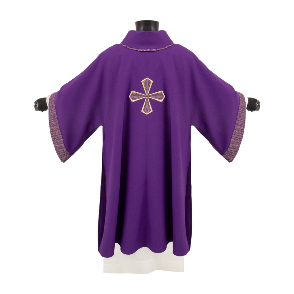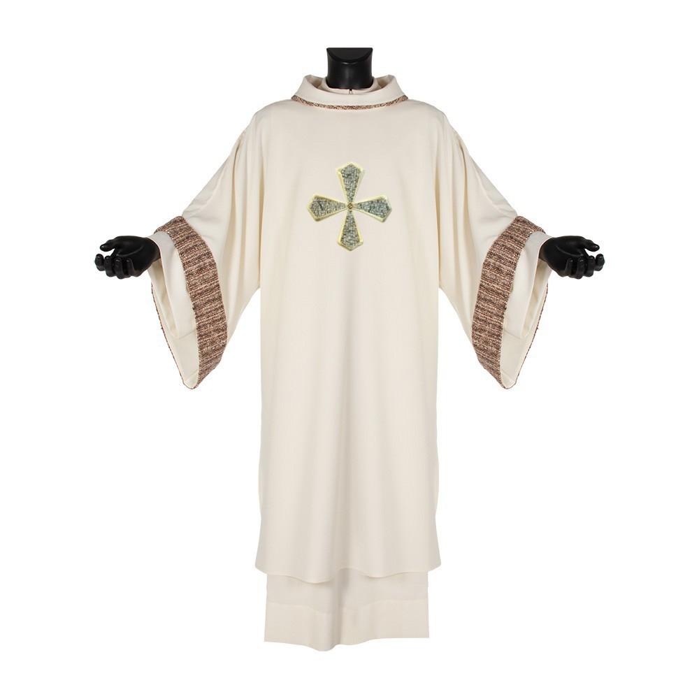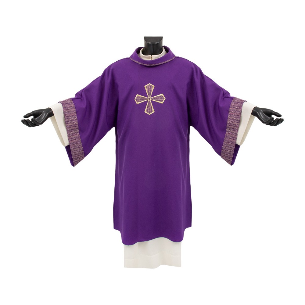 Questa dalmatica presenta una croce e semplici rifiniture in tessuto sia sul collo che sulle maniche.