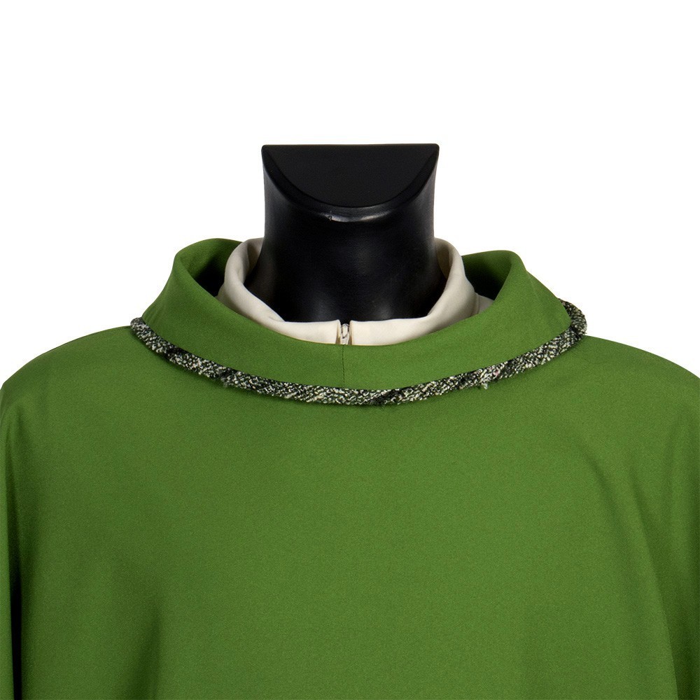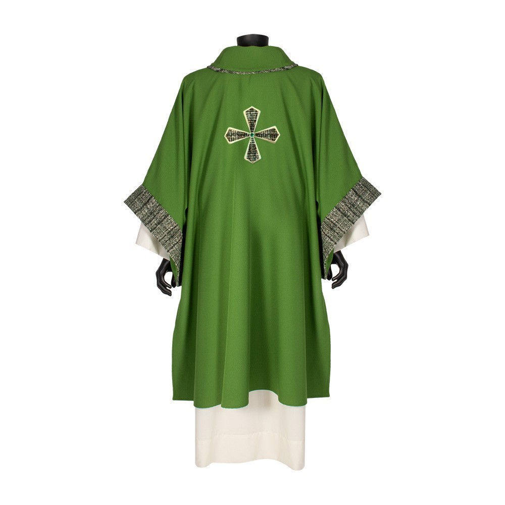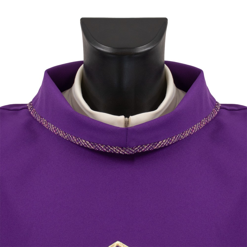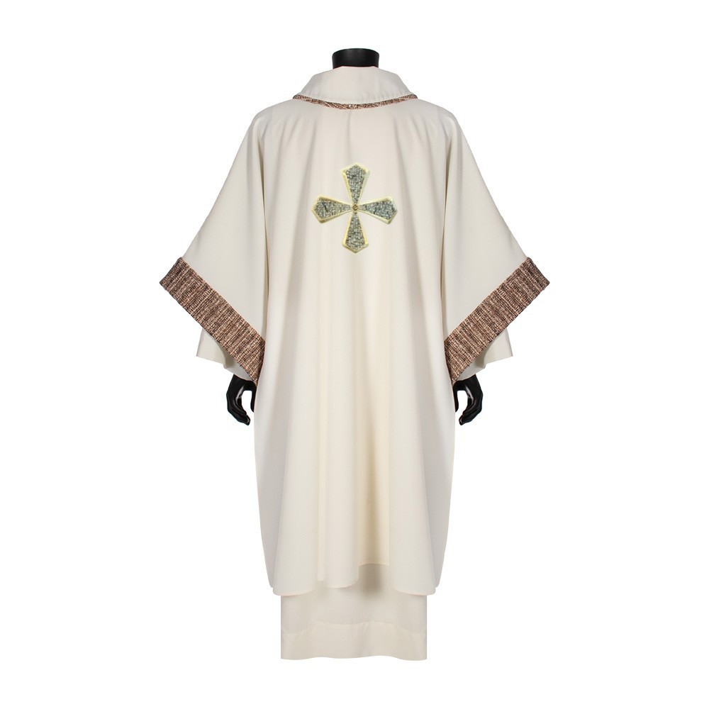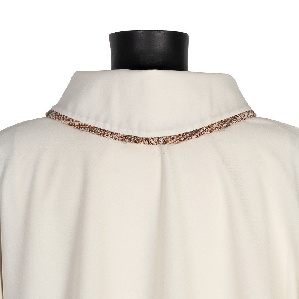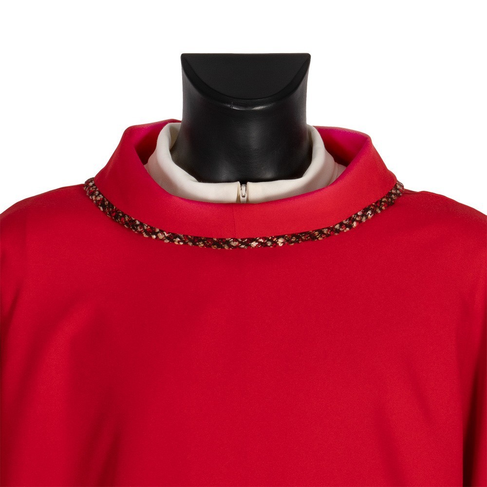 Questa dalmatica presenta una croce e semplici rifiniture in tessuto sia sul collo che sulle maniche.