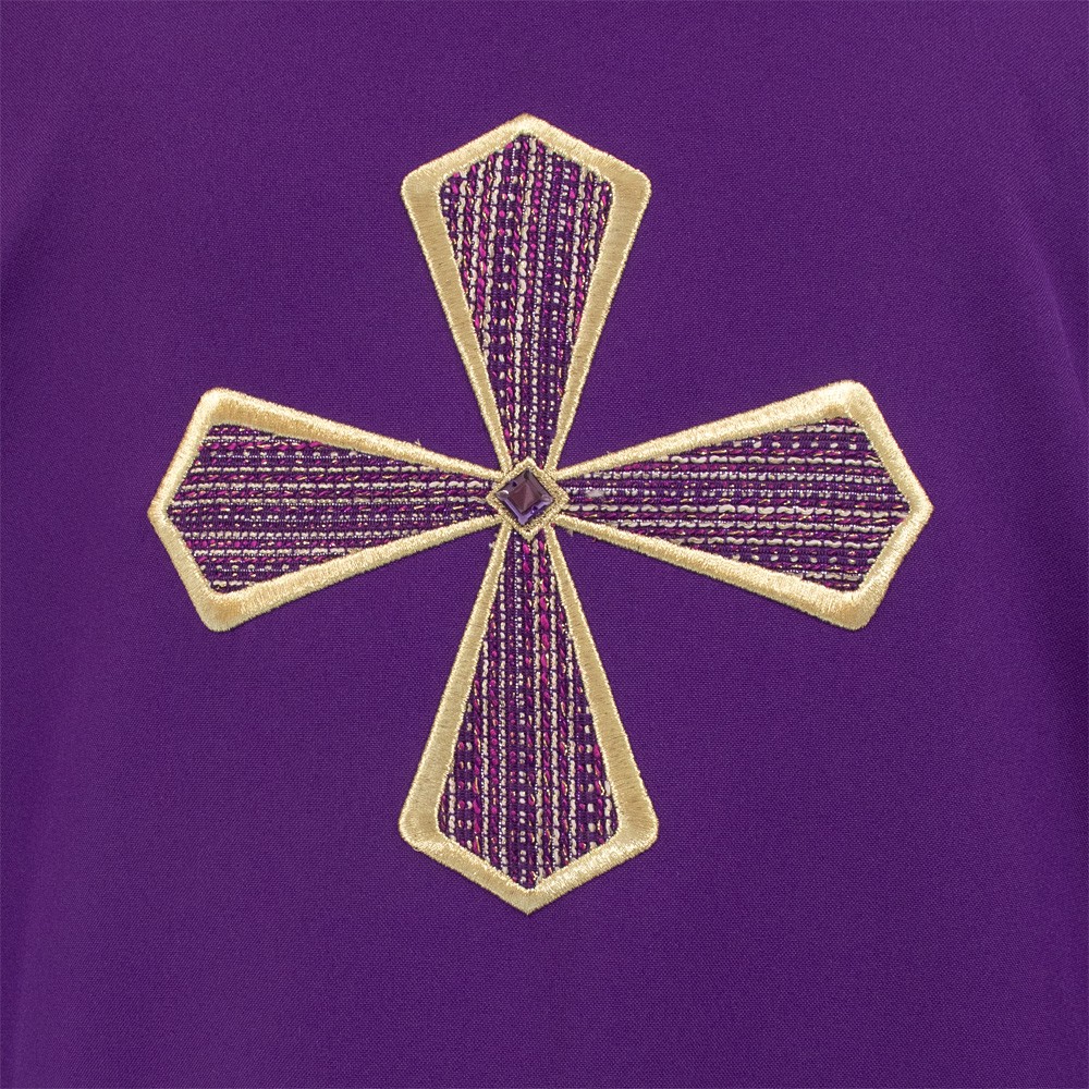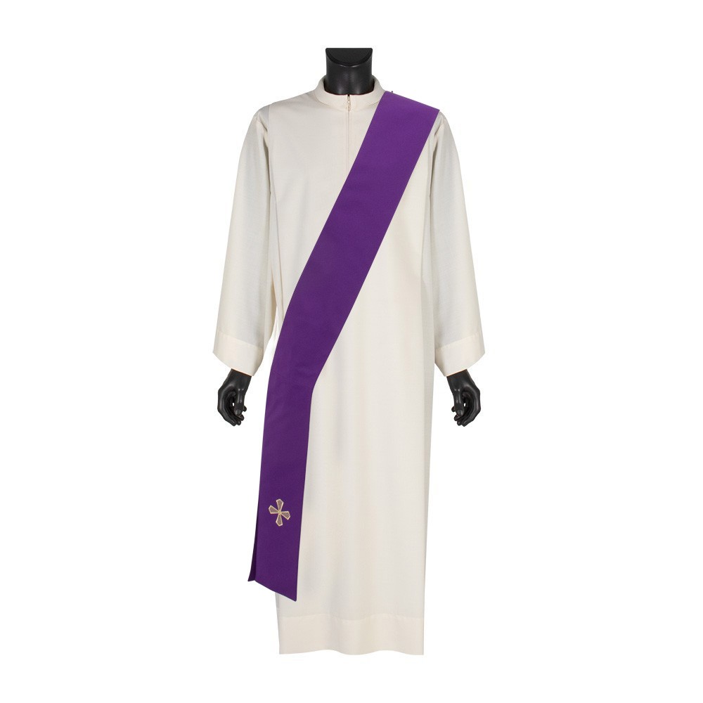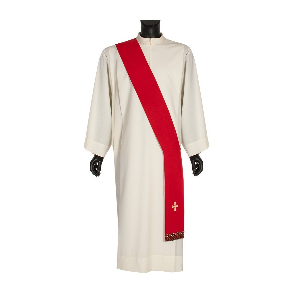 Dalmatica liturgica per diacono con croce ricamata e strass centrale, realizzata in tessuto 100% poliestere.