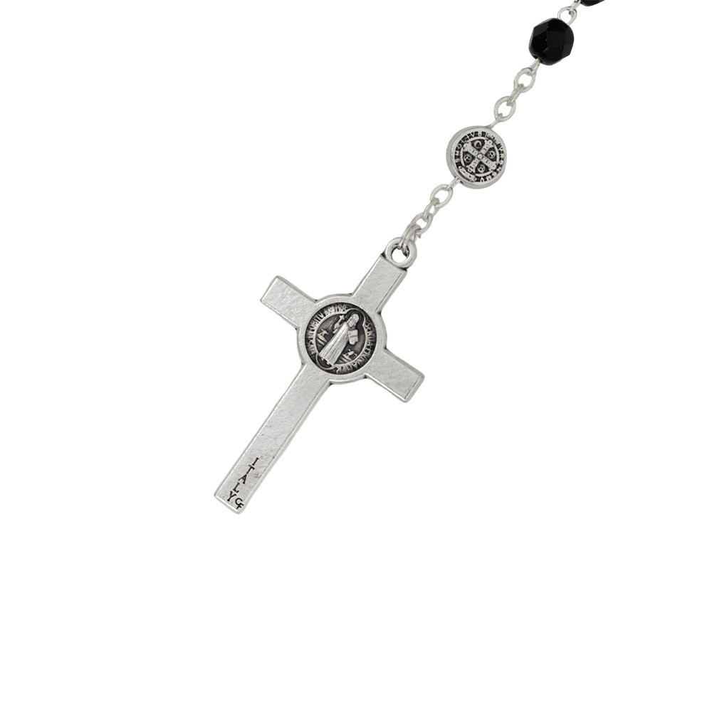 Corona del Rosario di San Benedetto realizzata con piccoli grani neri, medagliette, crociera e crocifisso in metallo argentato.