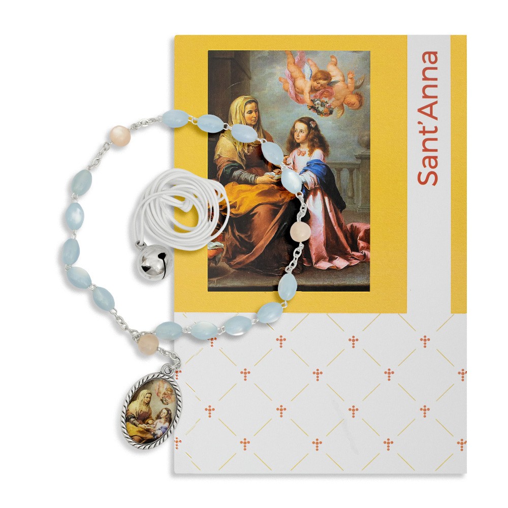 Coroncina rosario dedicato a Sant'Anna con grani in simil madreperla e collana chiama angeli con sonaglio.