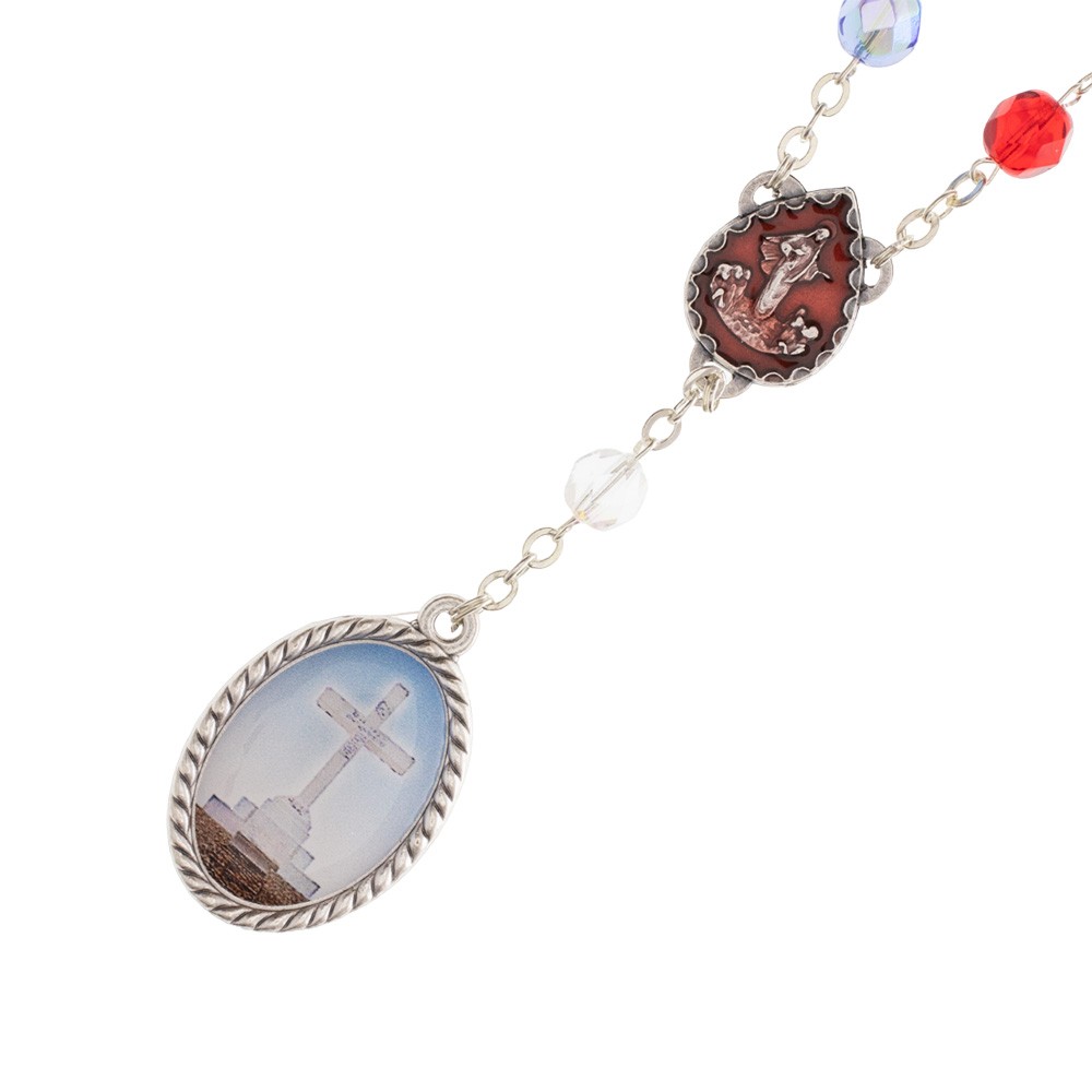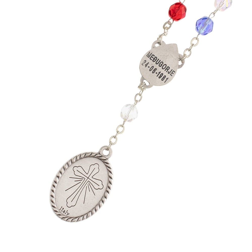La coroncina è realizzata con grani tondi blu, rossi e trasparenti dal diametro di 0,7 cm, mentre le medaglie e la legatura sono in metallo argentato.