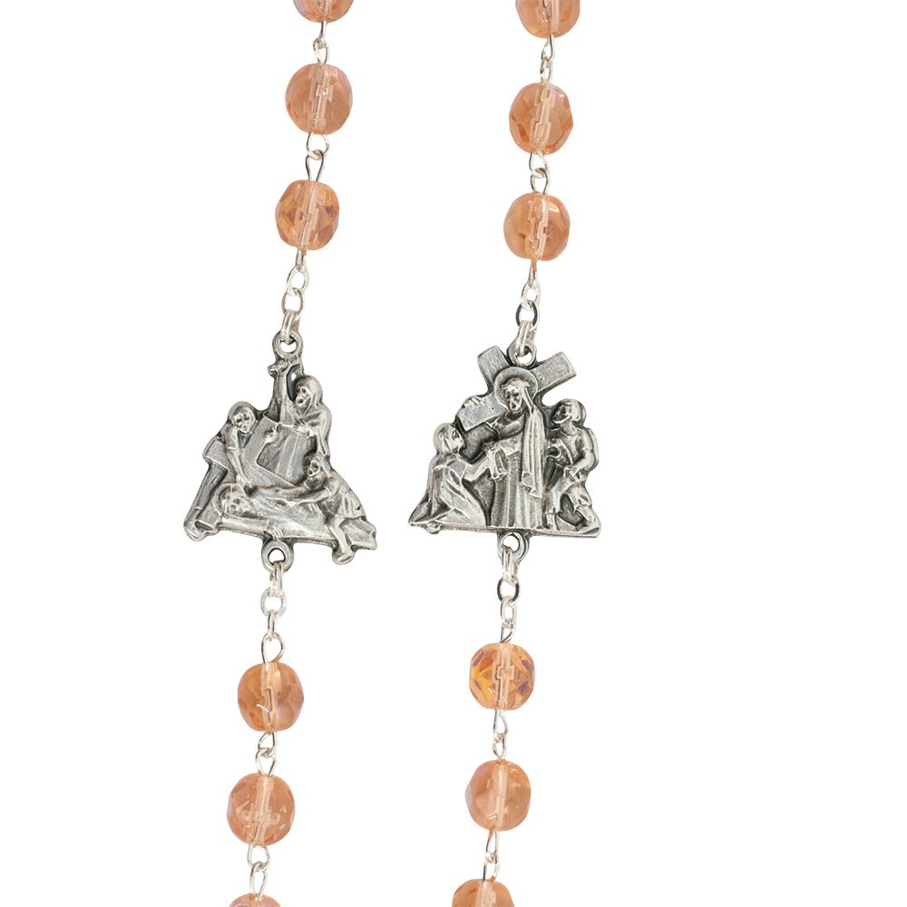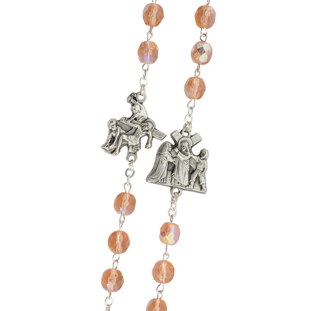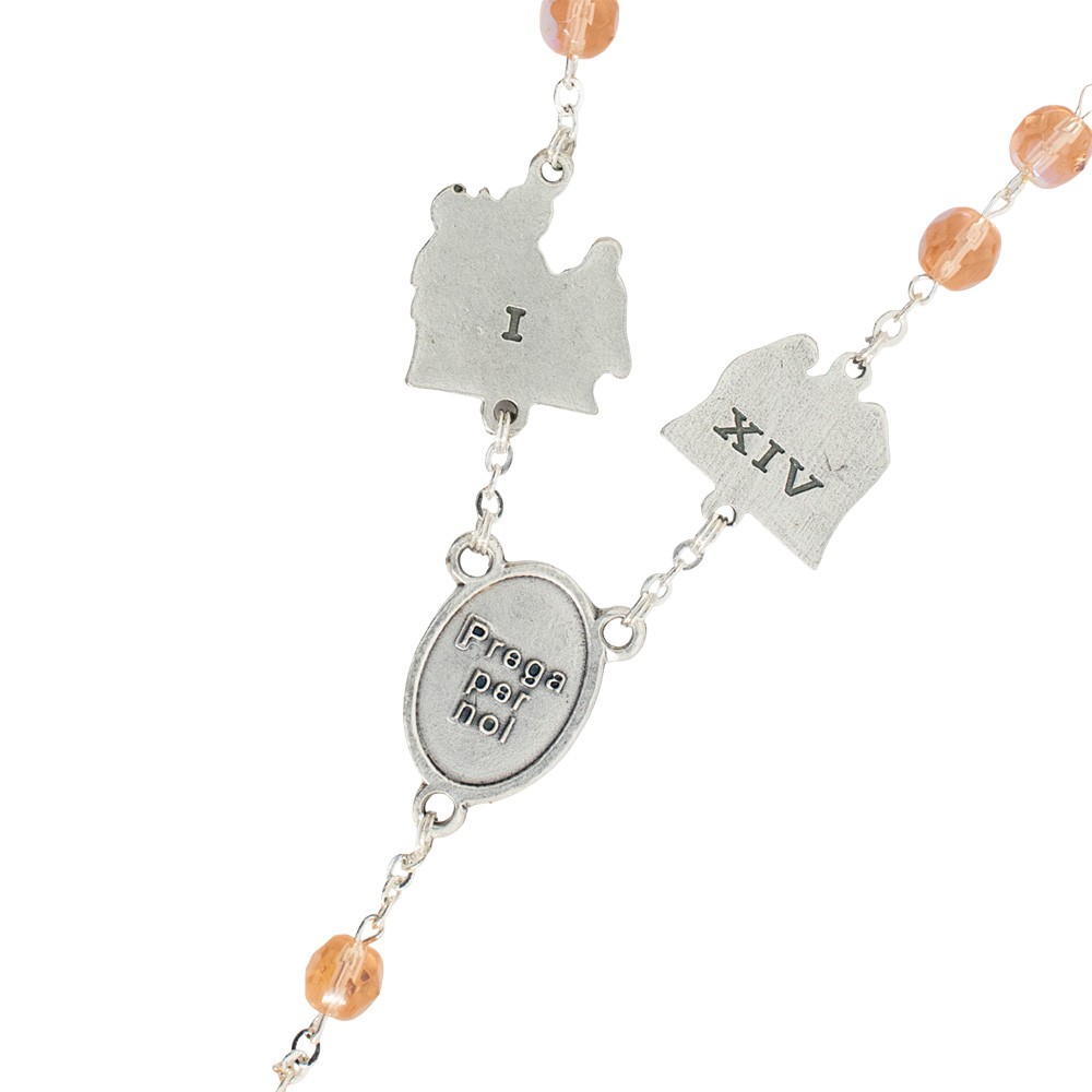 Realizzato con graziosi grani in vetro sfaccettato di colore rosa, medaglie in metallo argentato che raffigurano le 14 stazioni della Via Crucis e crociera ovale con l'immagine di Gesù Risorto che indica la 15° stazione.