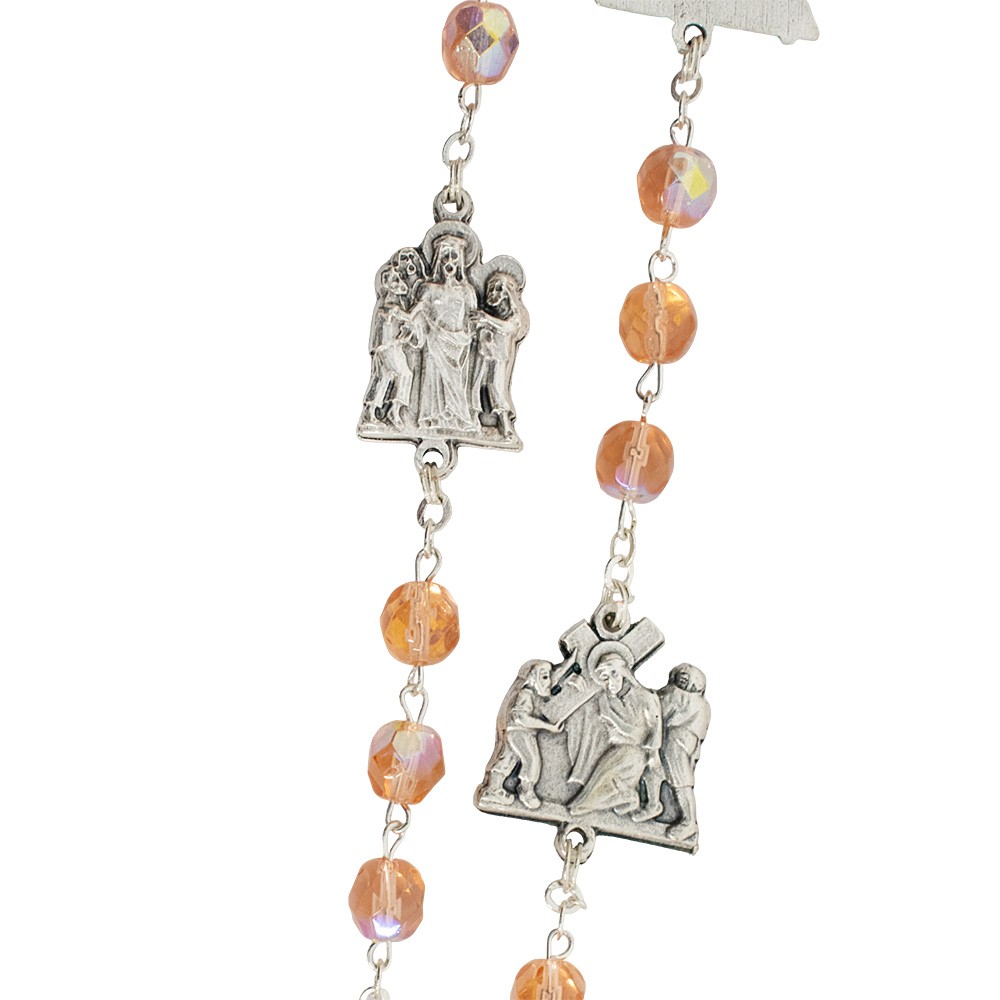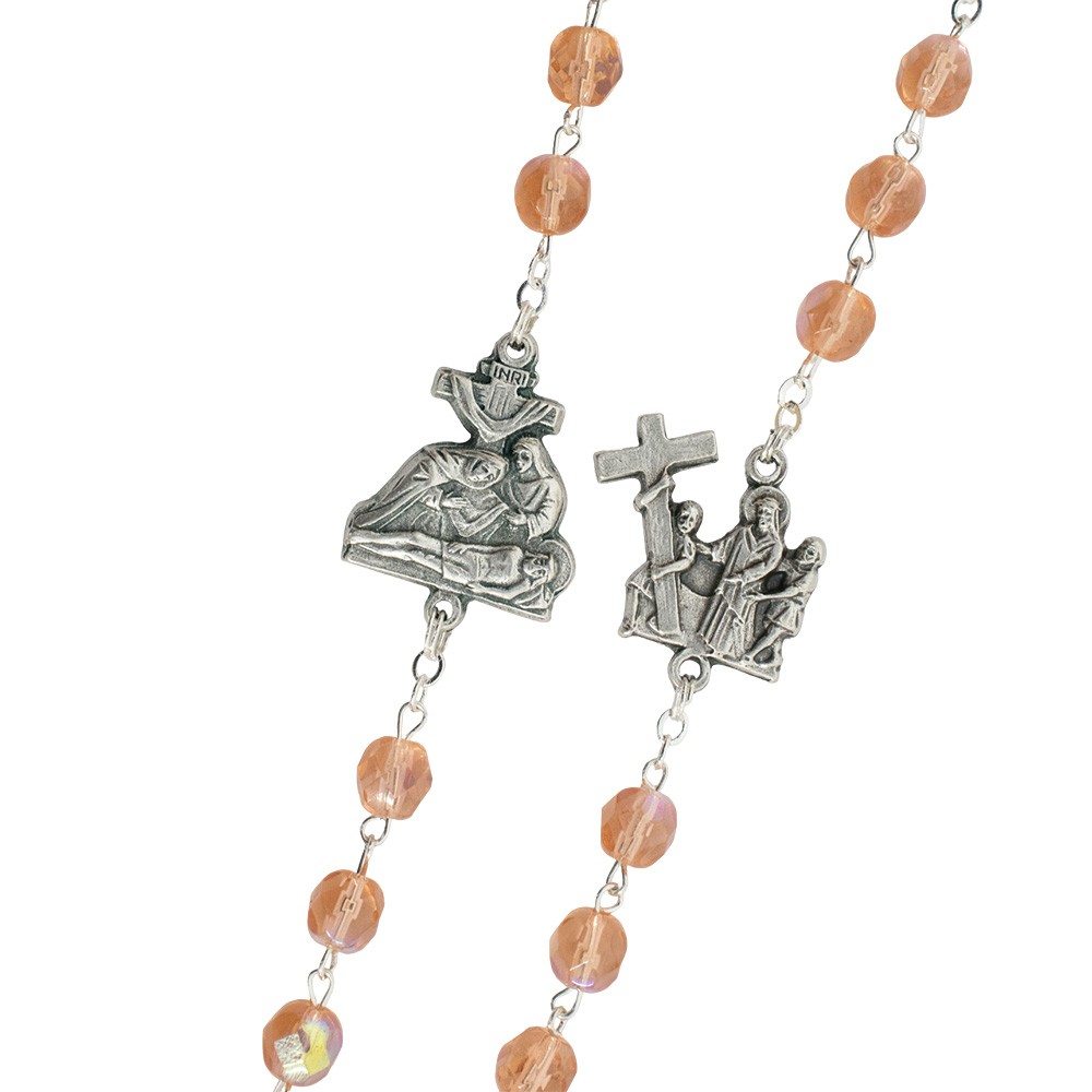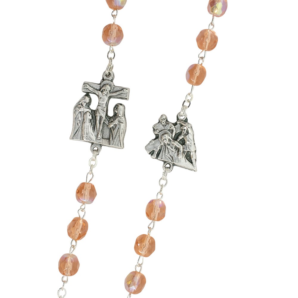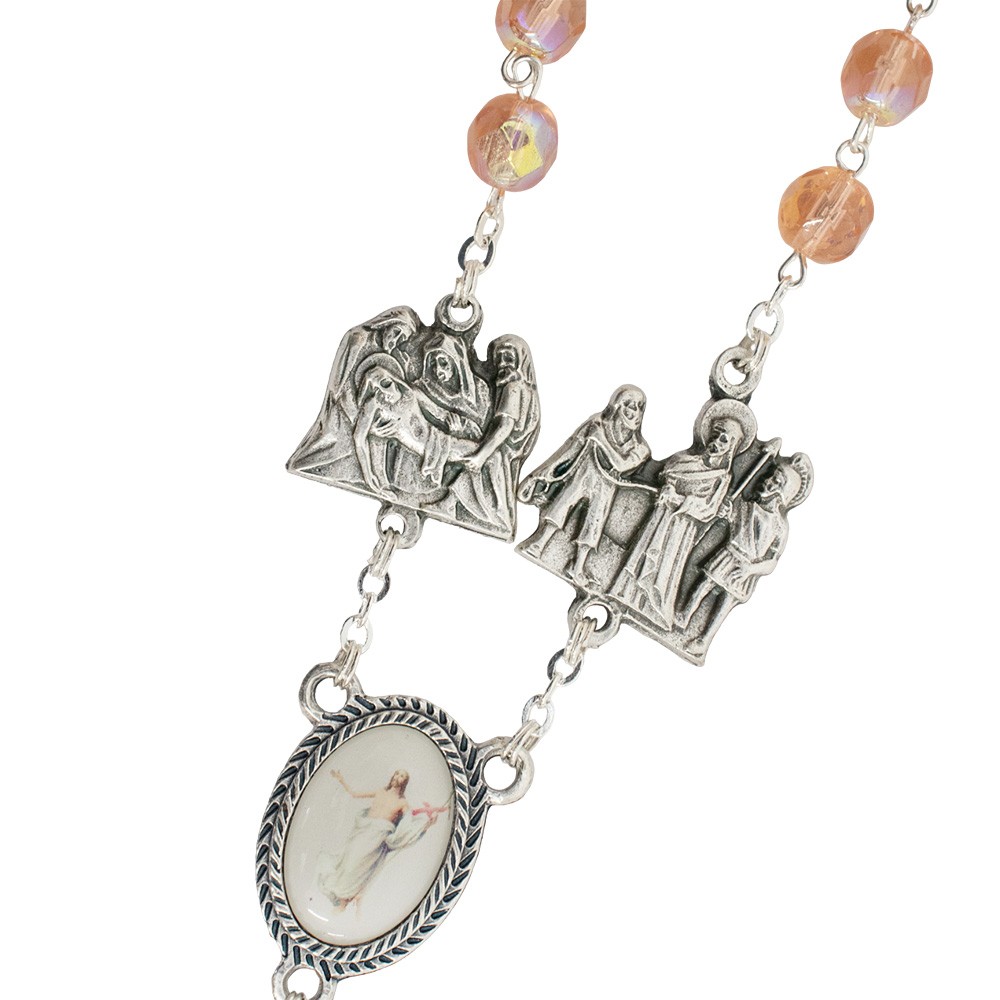 Realizzato con graziosi grani in vetro sfaccettato di colore rosa, medaglie in metallo argentato che raffigurano le 14 stazioni della Via Crucis e crociera ovale con l'immagine di Gesù Risorto che indica la 15° stazione.