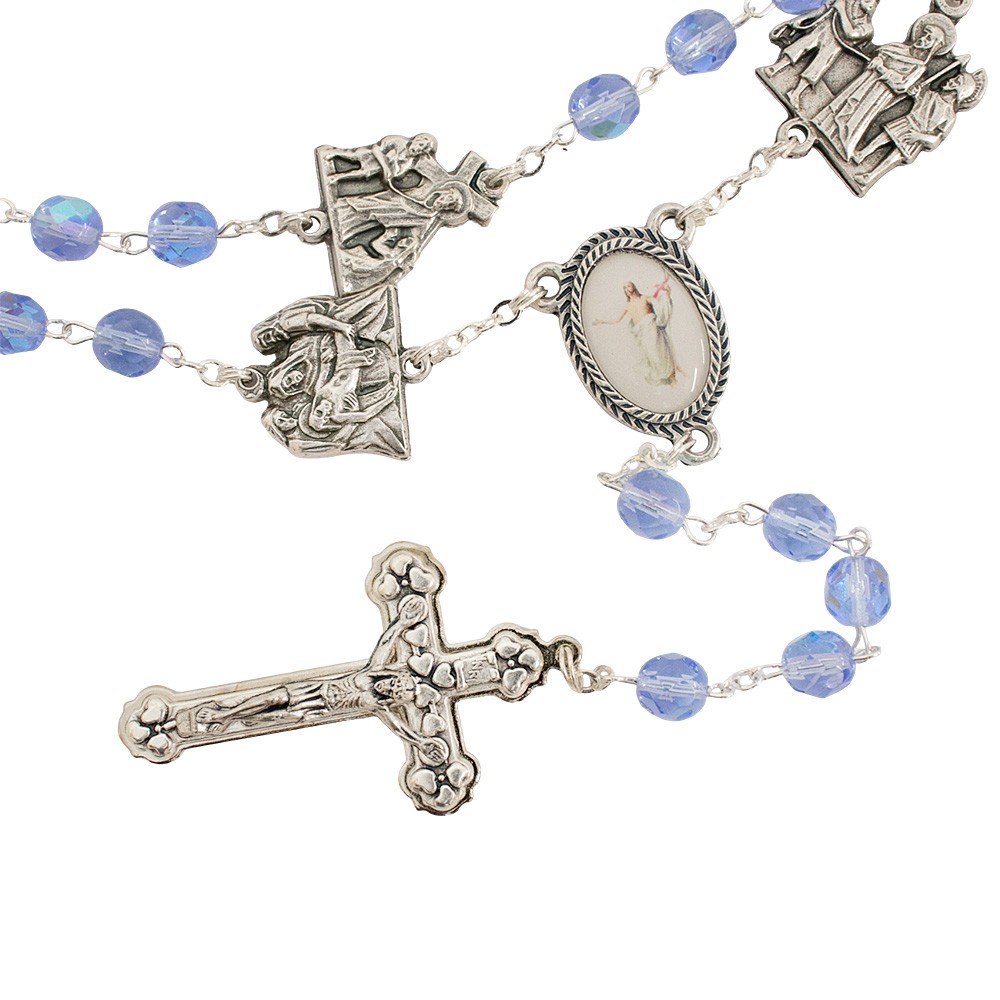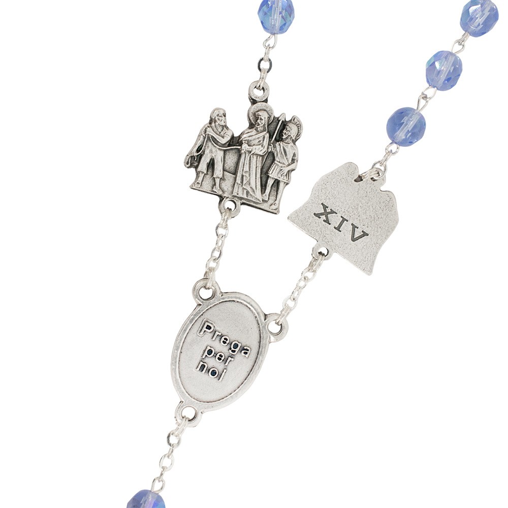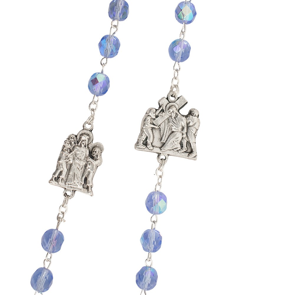 Realizzato con graziosi grani in vetro sfaccettato di colore celeste, medaglie in metallo argentato che raffigurano le 14 stazioni della Via Crucis e crociera ovale con l'immagine di Gesù Risorto che indica la 15° stazione.