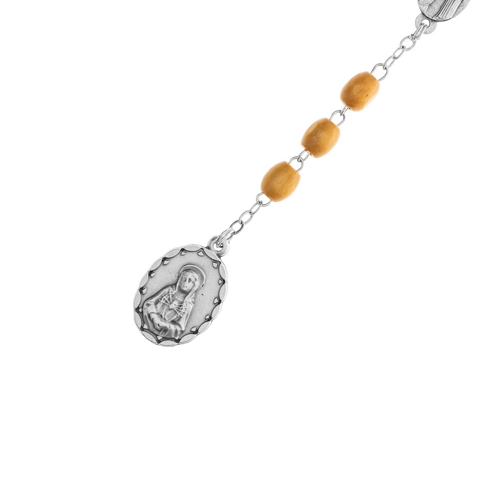 Coroncina dei sette dolori. Realizzata con grani ovali in legno da 8 mm, con medaglie in zama.