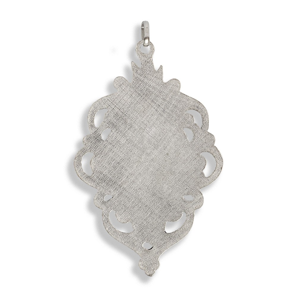 Realizzato in metallo argentato, misura 8x5 cm.