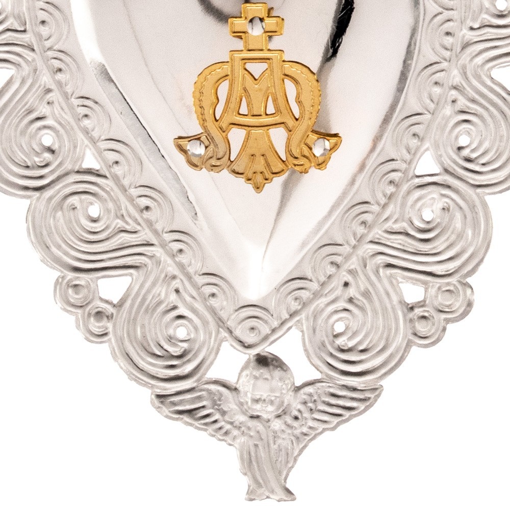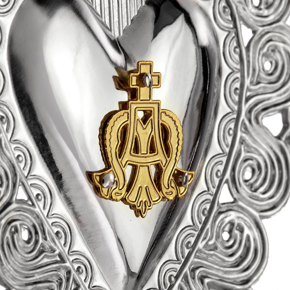 Questo Ex voto è realizzato in metallo, completo di fiamma e decori floreali. Sul cuore vi è applicato lo stemma Mariano. Made in Italy. Imbustato.