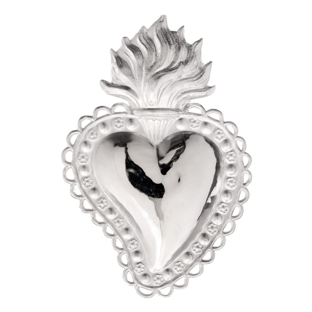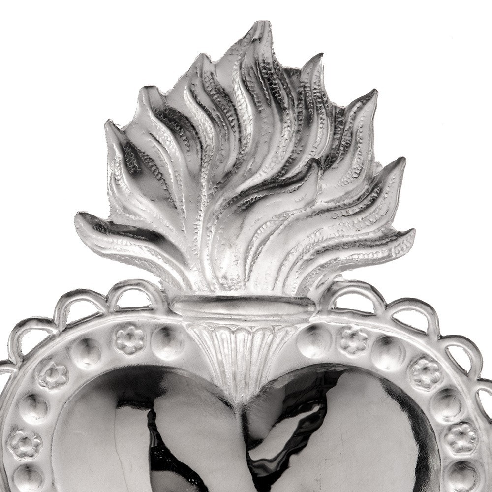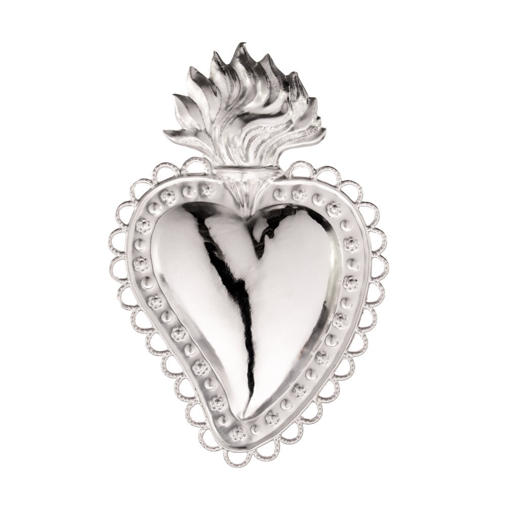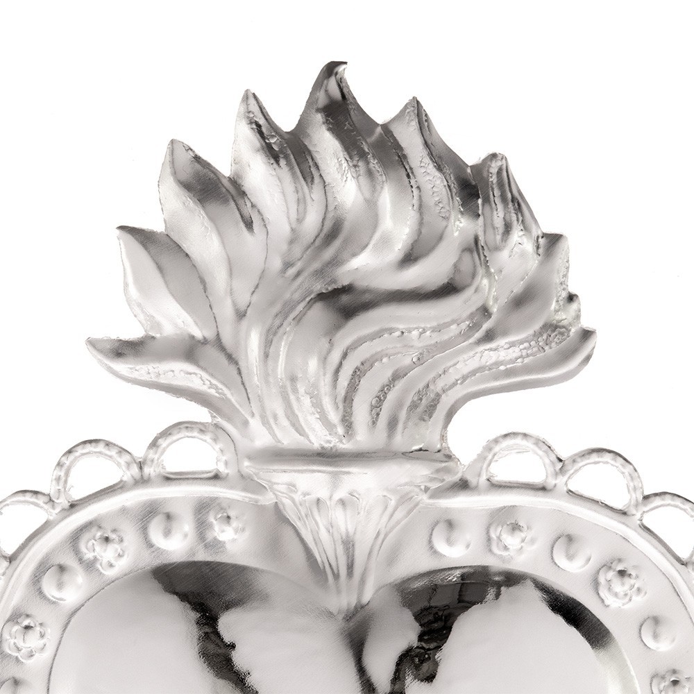 Ex voto in metallo argentato raffigurante un cuore liscio con fiamma e decori. Produzione Made in Italy. Fornito con scatola.