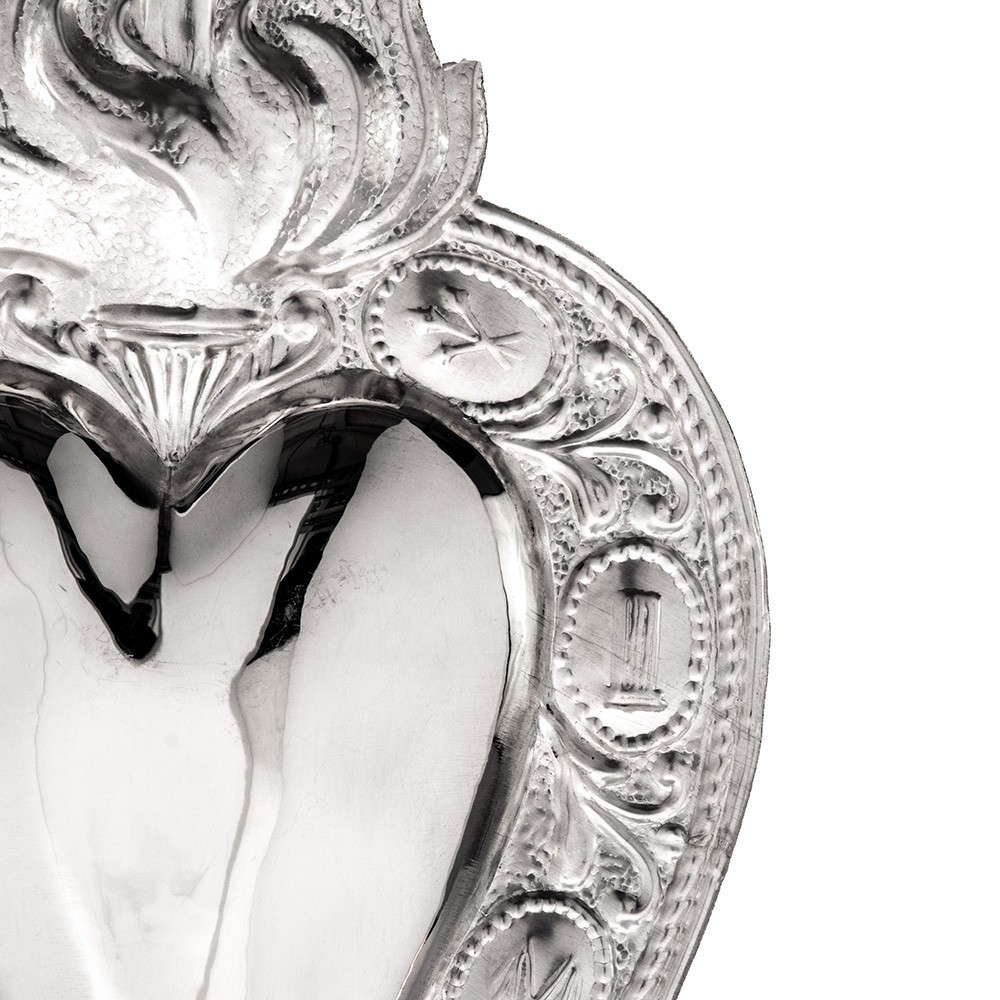 Ex voto in in metallo argentato. Cuore votivo con fiamma, croce e decorazioni. Produzione italiana. Il cuore votivo è alto 15 cm ed è largo 10 cm.