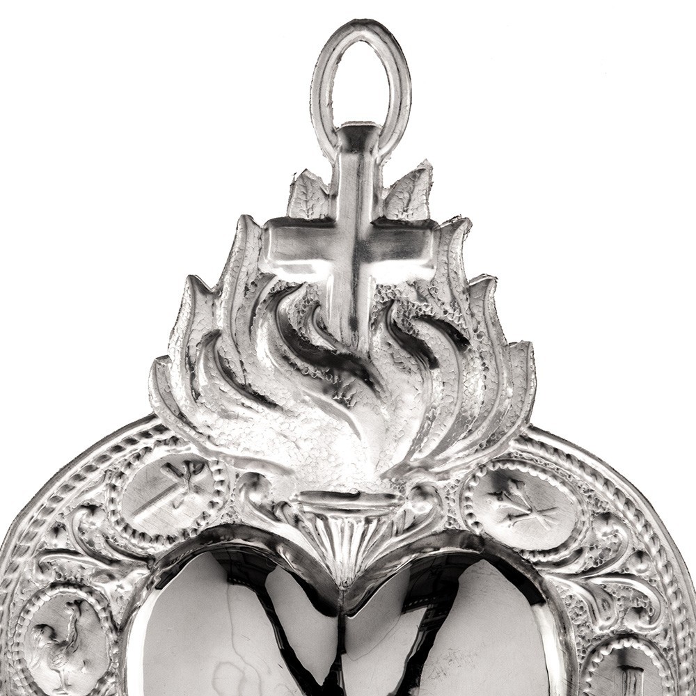 Ex voto in metallo con cuore decorato.