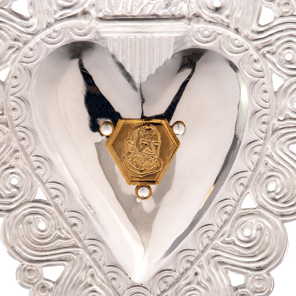 Cuore votivo realizzato in metallo argentato con immagine di Padre Pio. Articolo di ottima qualità, 100% italiano. Imbustato.