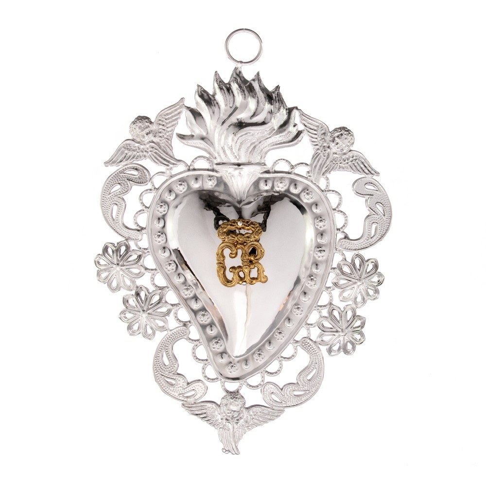 Ex Voto in metallo argentato, formato da tre angeli, fiori, foglie e fiamma. Sul cuore liscio sono applicate le lettere GR (Grazia Ricevuta) di color oro. E' un articolo di ottima qualità, produzione made in Italy. Questo ex voto viene consegnato in bustina trasparente.