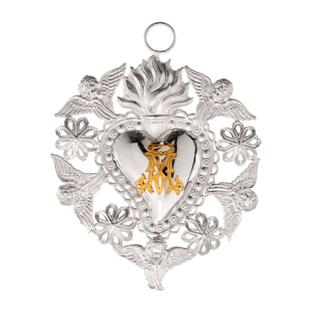 Questo cure votivo è realizzato interamente in metallo argentato, formato da quattro fiori, cinque angeli e fiamma. Sul cuore vi è applicato il monogramma Mariano. Articolo di ottima qualità, produzione italiana. Imbustato.
