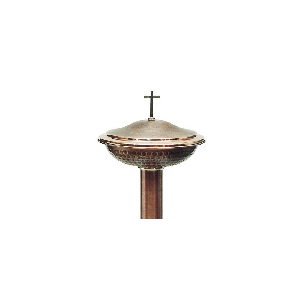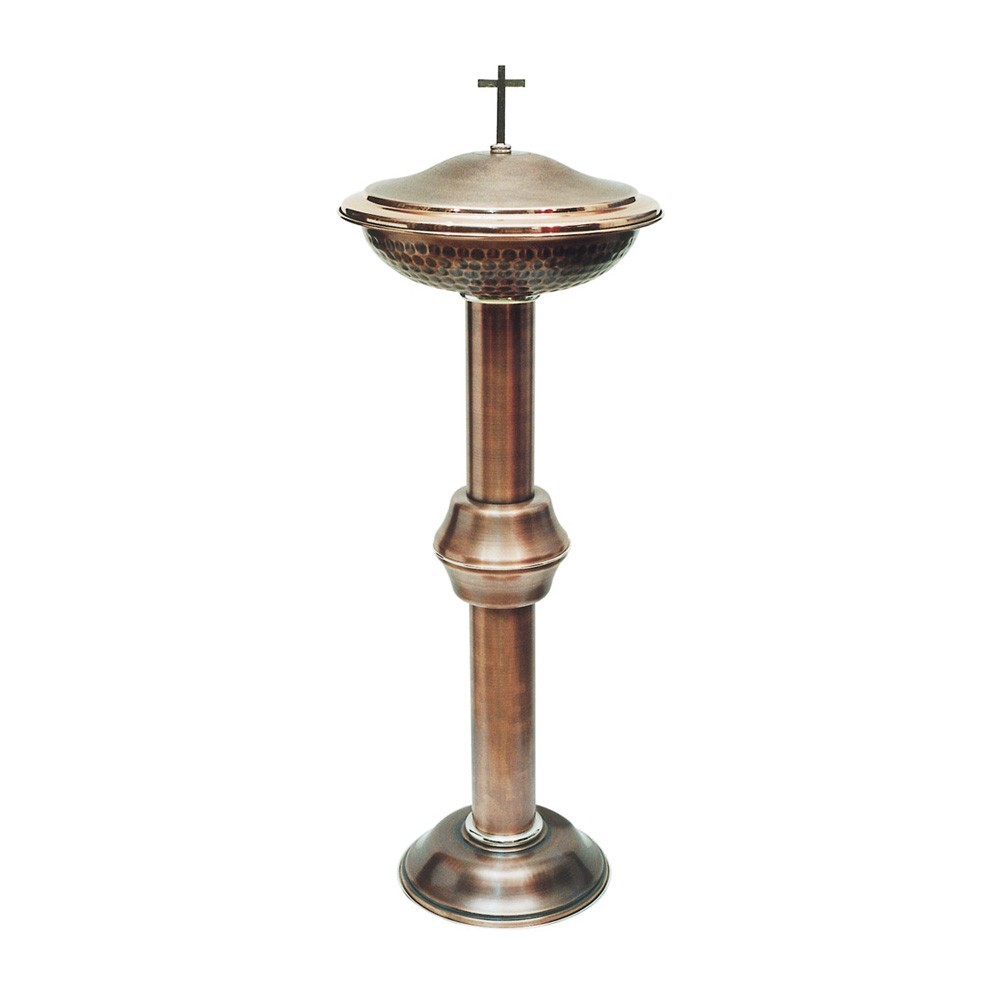 Realizzato interamente in ottone satinato liscio. La vasca superiore per l'acqua battesimale è martellata con l'interno in alluminio estraibile, completa di coperchio e croce.
