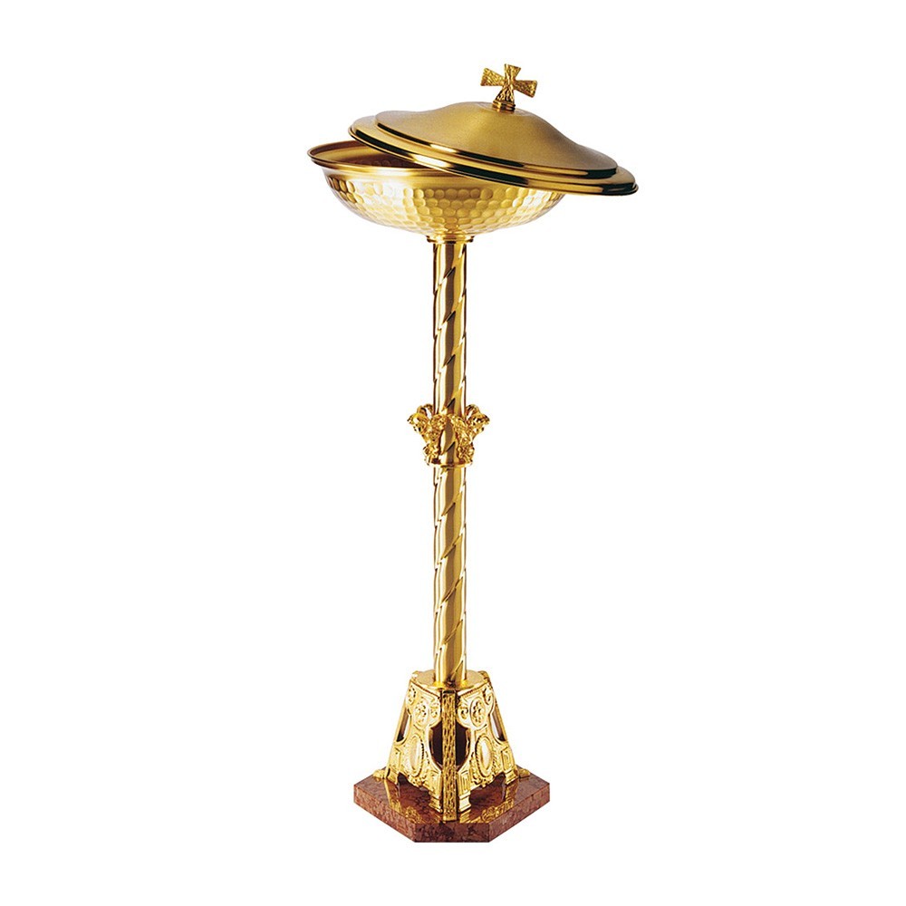 Questo Fonte Battesimale a colonna è in stile barocco, realizzato interamnete in ottone con finitura dorata. La base del battistero è in marmo rosso di Verona e la vasca è martellata con un diametro di 40 cm.