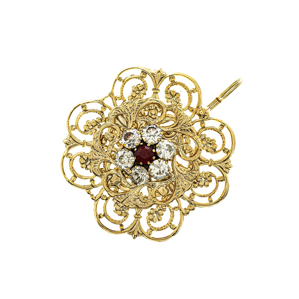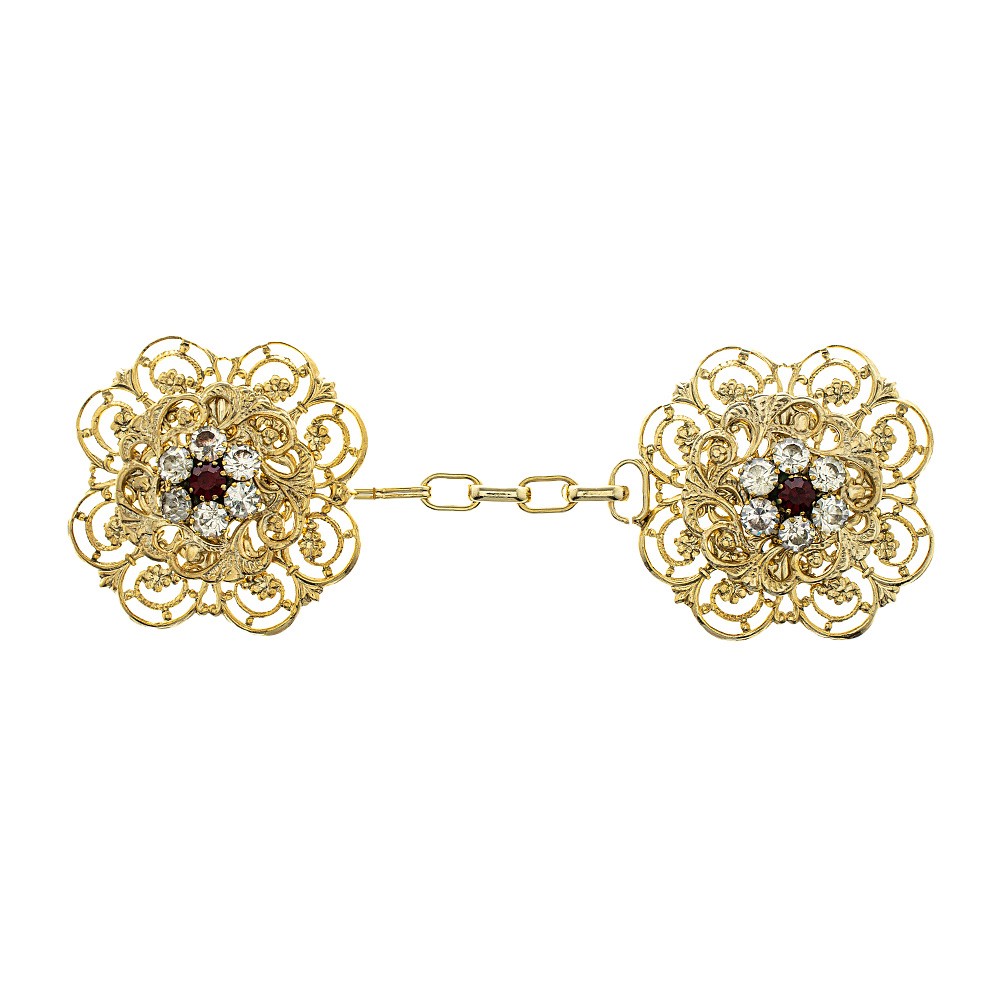 Gancio per piviale in filigrana dorato impreziosito con strass bianco e rubino a forma di fiore. Completo di catenella.