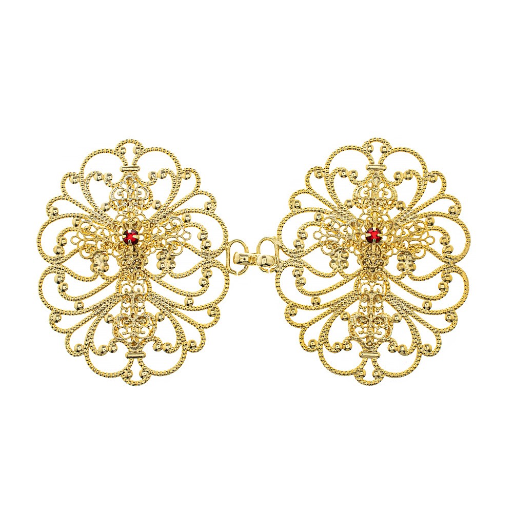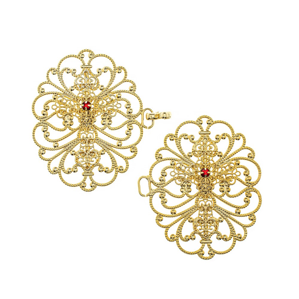 Gancio per piviale liturgico a forma ovale con croce decorata in rilievo e strass rosso.