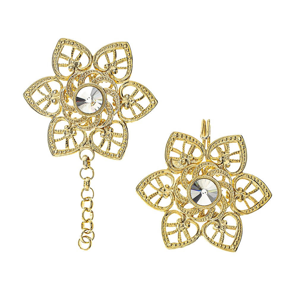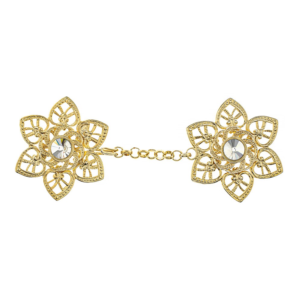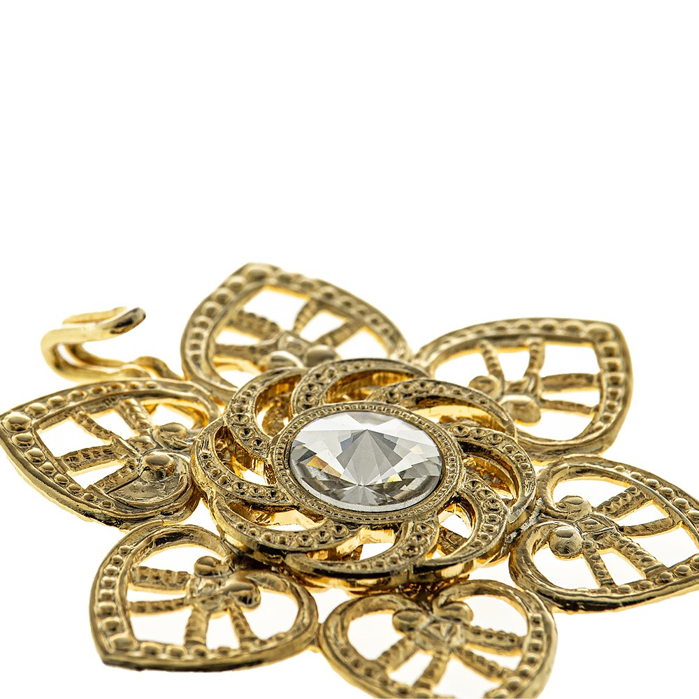 Gancio per piviale decoro "fiore" in metallo dorato con strass centrale di colore bianco.