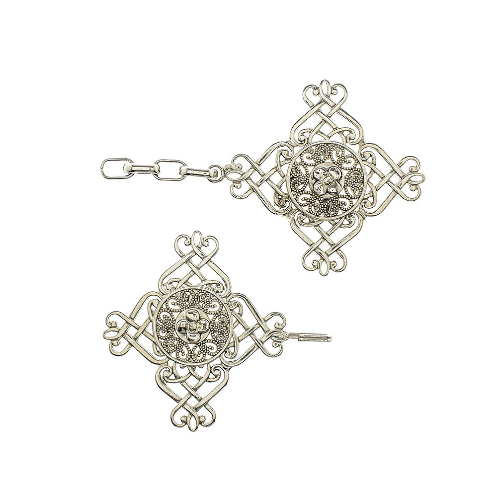 Gancio in metallo argento per piviale, mantelle e altri paramenti liturgici.