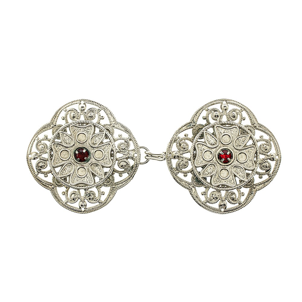 Gancio in metallo argentato con croce decorata e strass rosso centrale, ideale per piviali, mantelle e altri paramenti sacri.