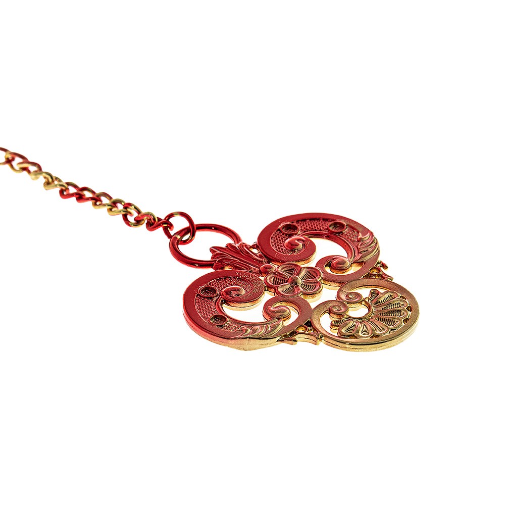 Il materiale utilizzato è interamente in metallo finitura oro e rosso, corredato di catenella.