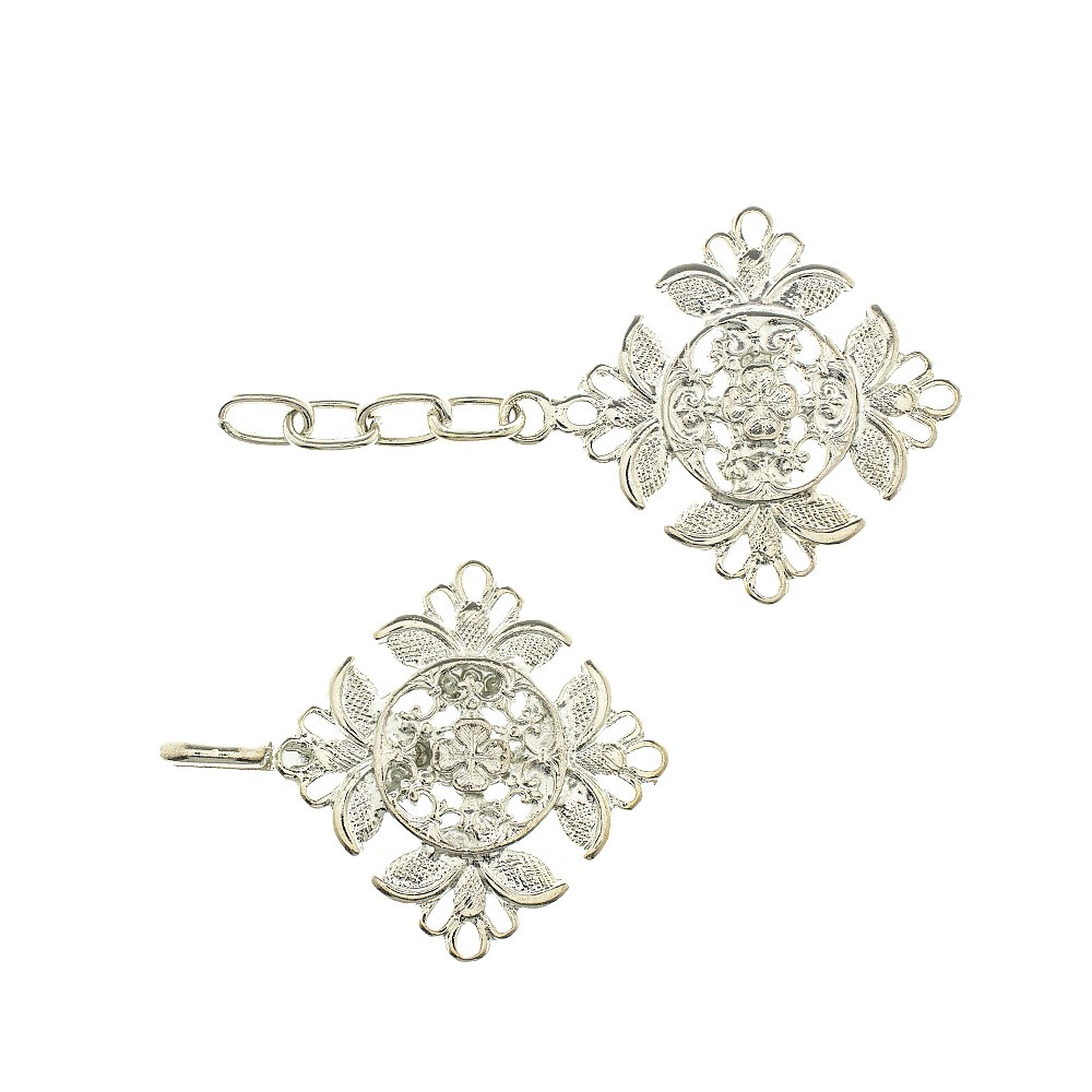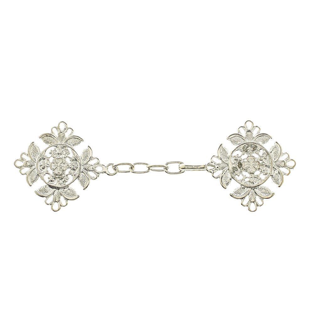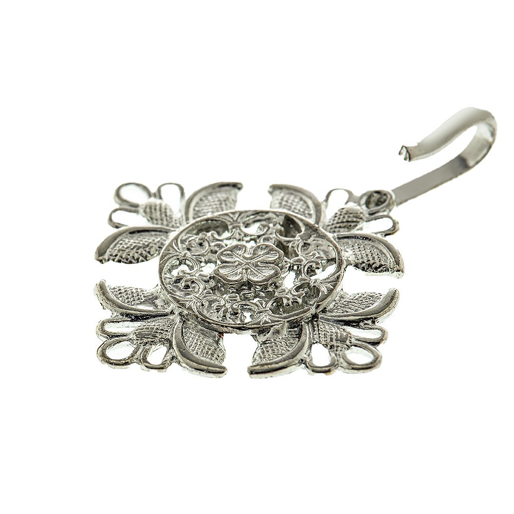 Gancio per piviale modello "quadrifoglio" realizzato interamente in metallo con finitura argento.
