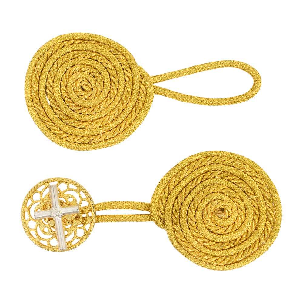 Elegante gancio per piviale e paramenti sacri, confezionato in rayon color oro e gancino tondo in metallo oro con applicazione di croce color argento.