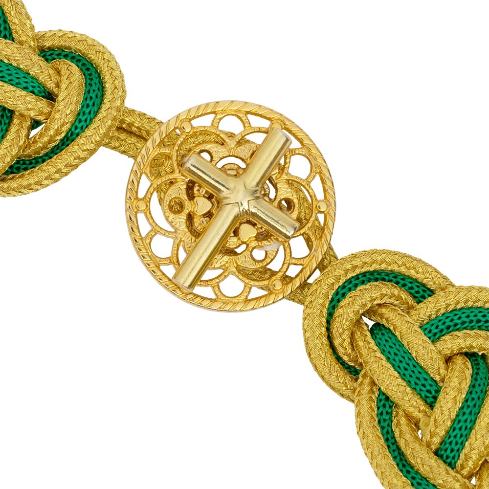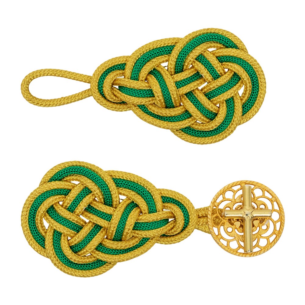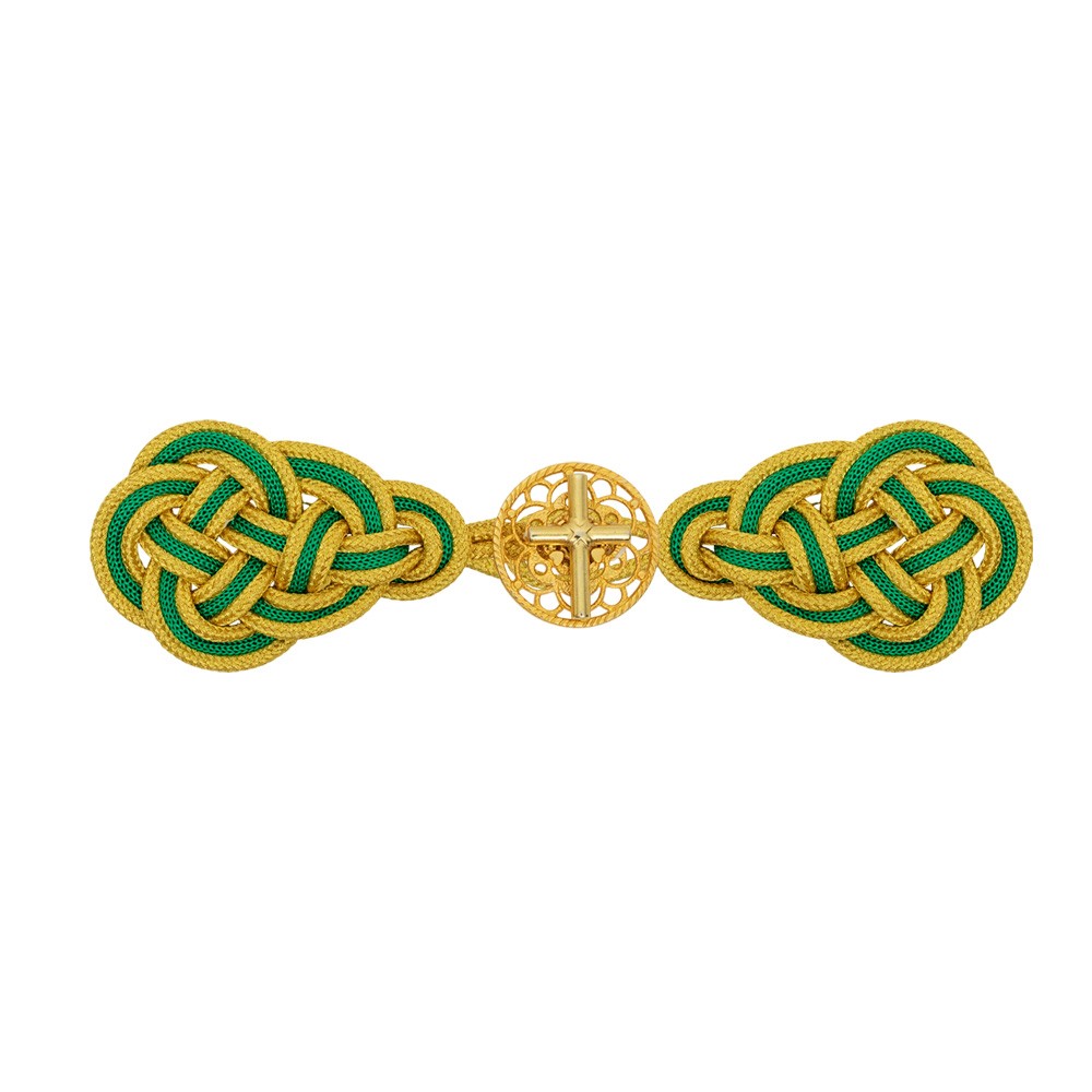 Gancio per piviale realizzato in metallo e decorato con passamaneria in rayon colorata verde e oro. Ideale per completare e arricchire l'eleganza del piviale durante le celebrazioni liturgiche. Questo gancio è un prodotto artigianale, interamente realizzato in Italia.