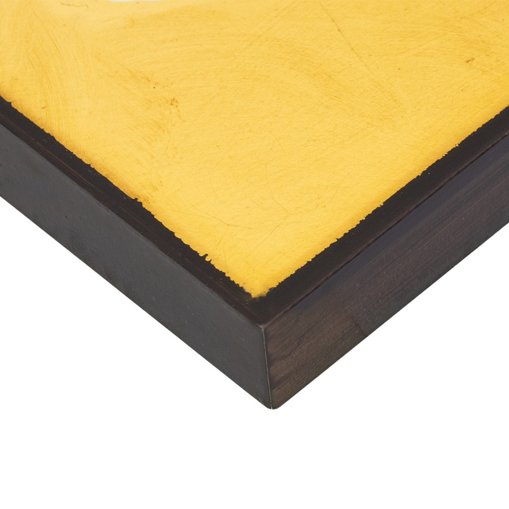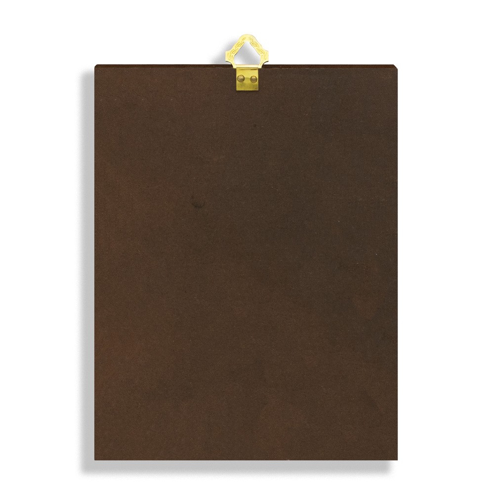 L'icona è realizzata su tavola in legno scuro con sfondo dorato, con la tecnica della serigrafia.