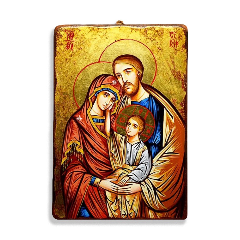 Icona Rumena dipinta a mano con foglia oro, immagine Sacra Famiglia. Realizzata nel rispetto della tecnica iconografica su legno massello. Corredata di certificato di autenticità applicato sul retro e scatola blu in velluto.