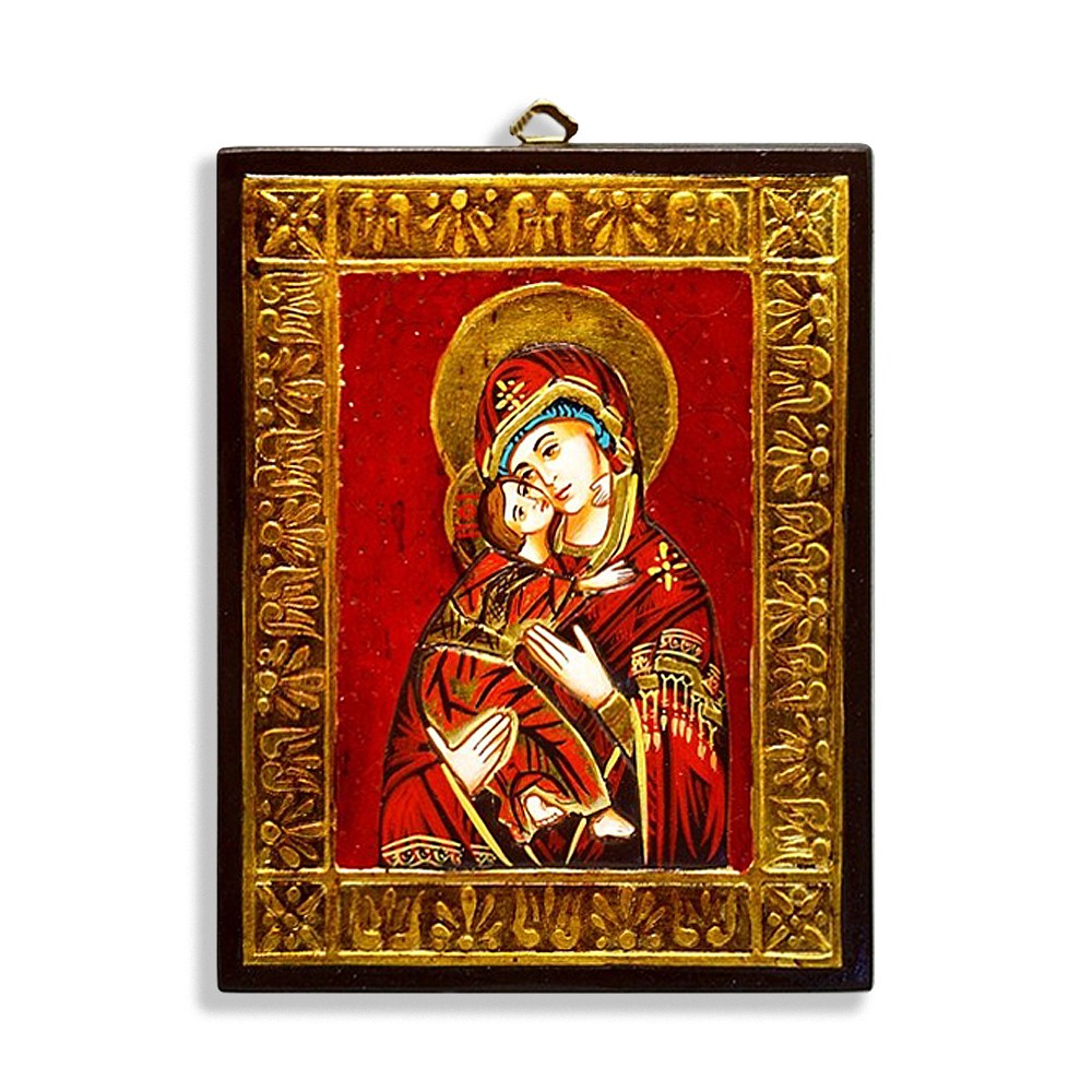 Icona Rumena dipinta a mano con foglia oro, immagine Vergine della Tenerezza. Realizzata nel rispetto della tecnica iconografica su legno massello. Corredata di certificato di autenticità applicato sul retro e scatola blu in velluto.
