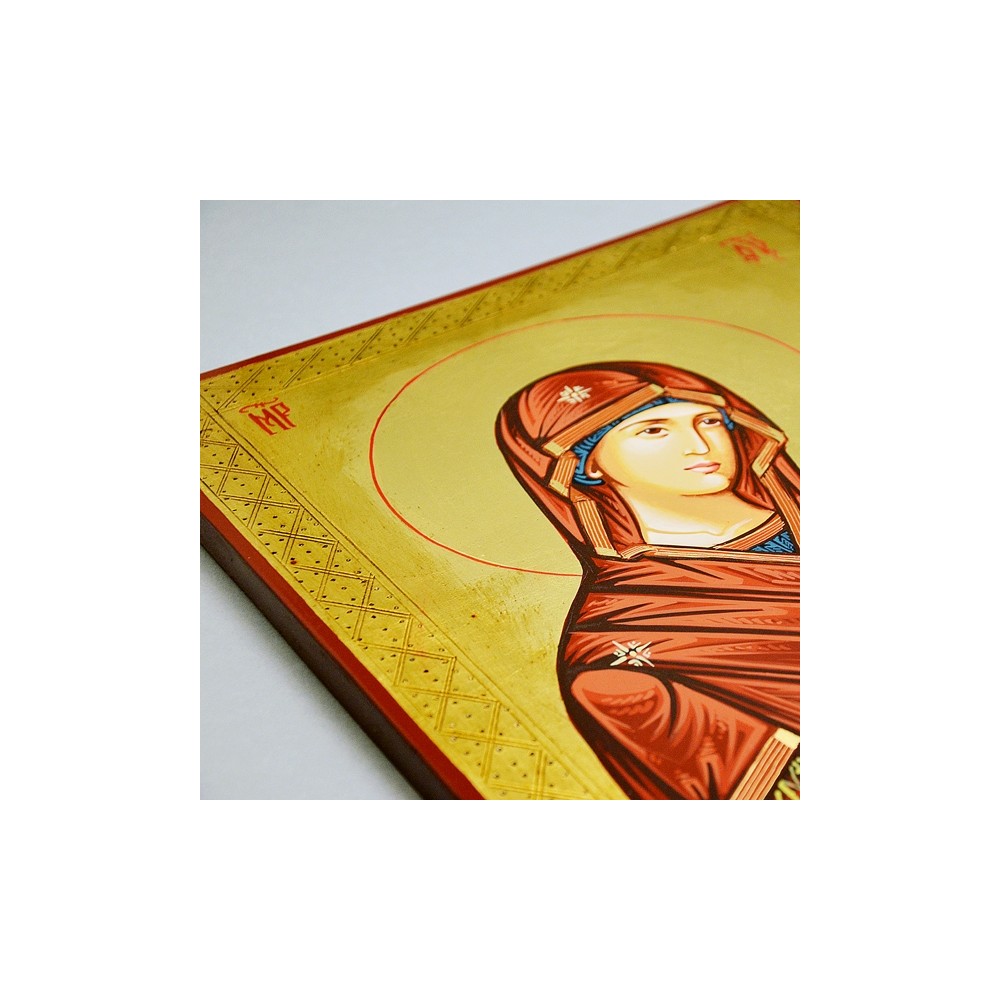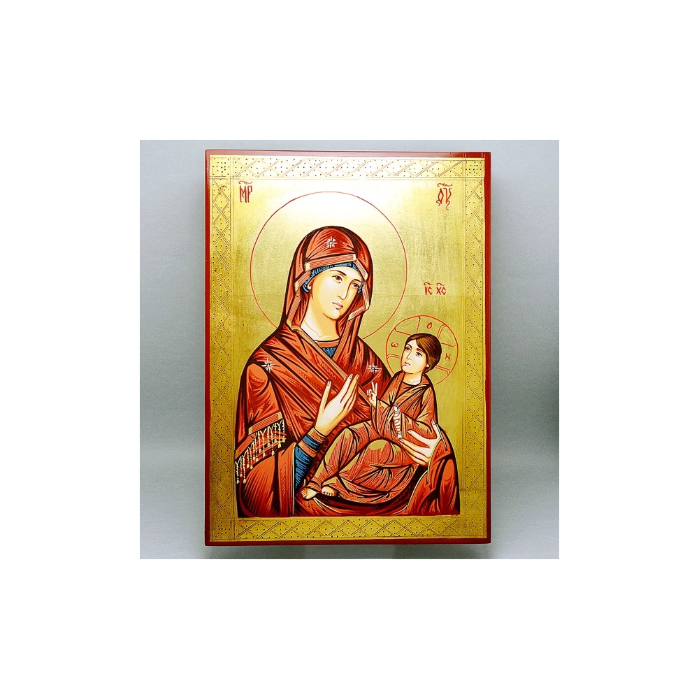 Icona Rumena dipinta a mano con foglia oro, immagine Vergine della Tenerezza. Realizzata nel rispetto della tecnica iconografica su legno massello. Corredata di certificato di autenticità applicato sul retro e scatola blu in velluto.